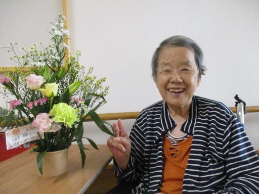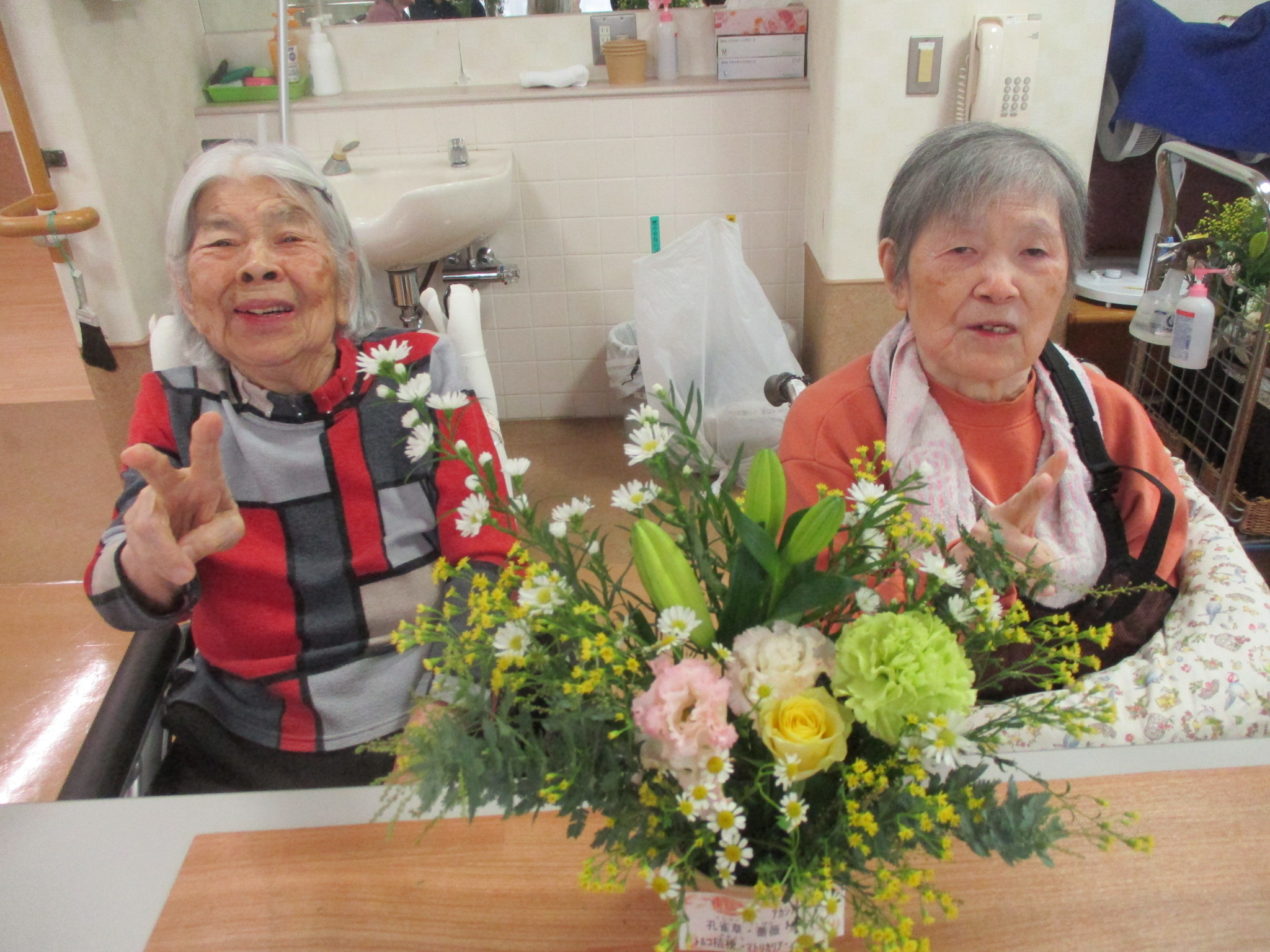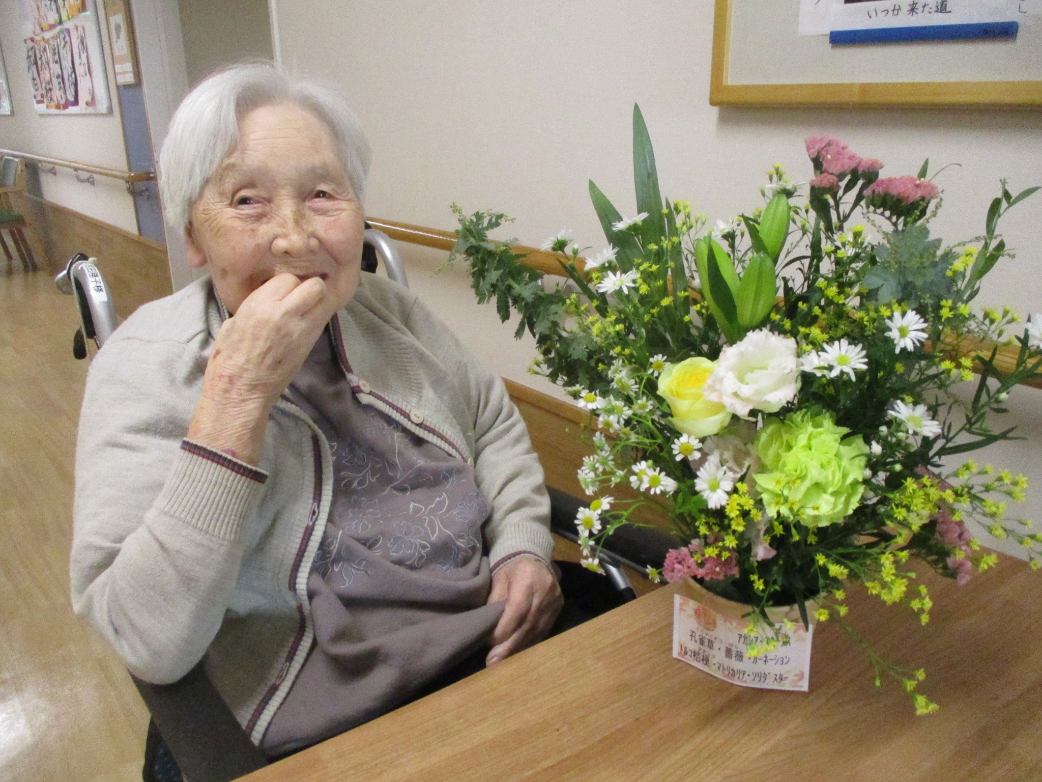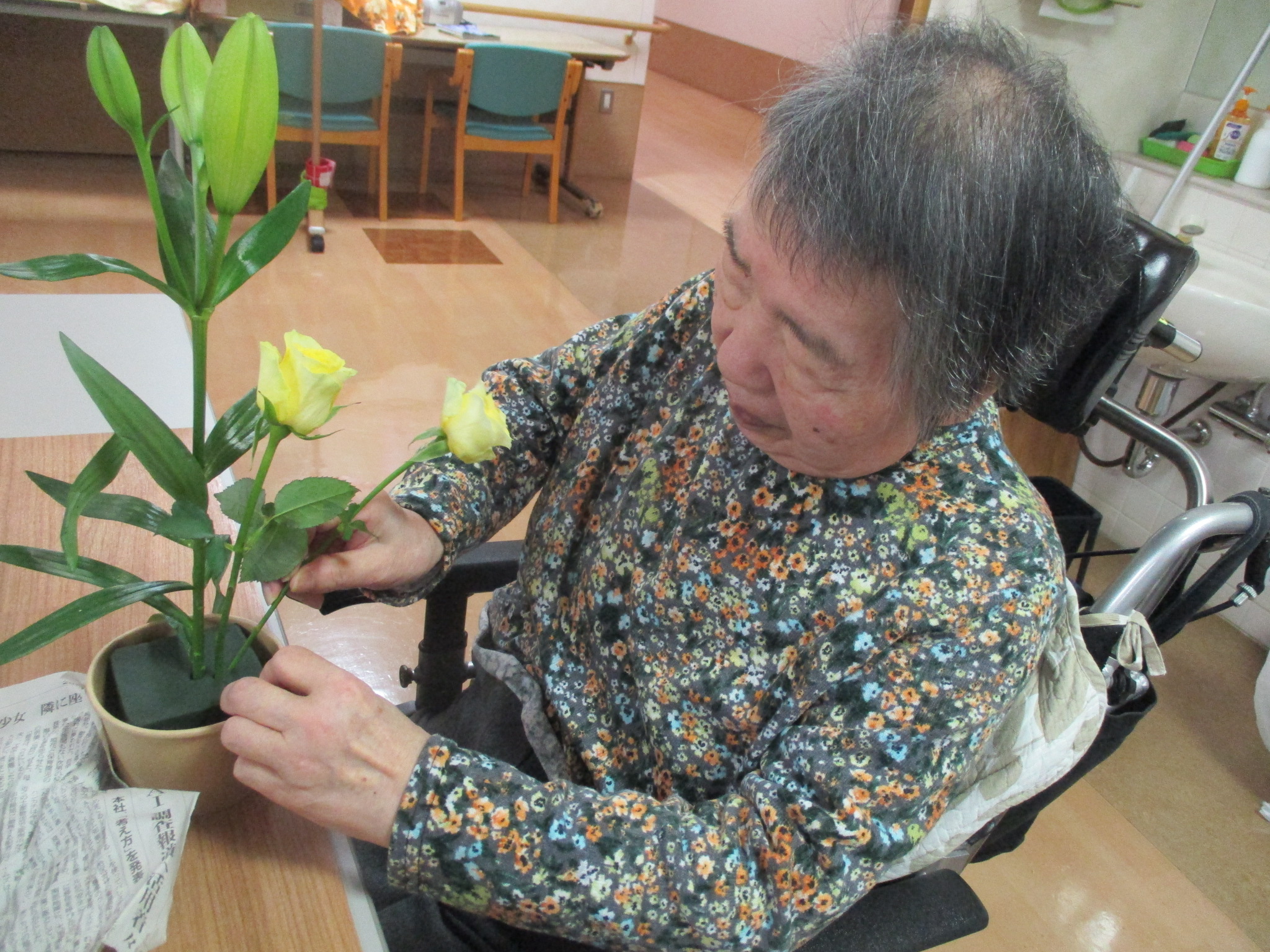 月に1回フラワーアレンジメントをおこなっています。 きれいな花をみると皆様も笑顔があふれます。 花の名前や花言葉、好きな花のお話など話しながら進めていきます。 高めに活けたり、低めにしたり、全方から眺めてもいいように活けたり と利用者様の好みや個性に合った素敵なアレンジメントが出来上がります。