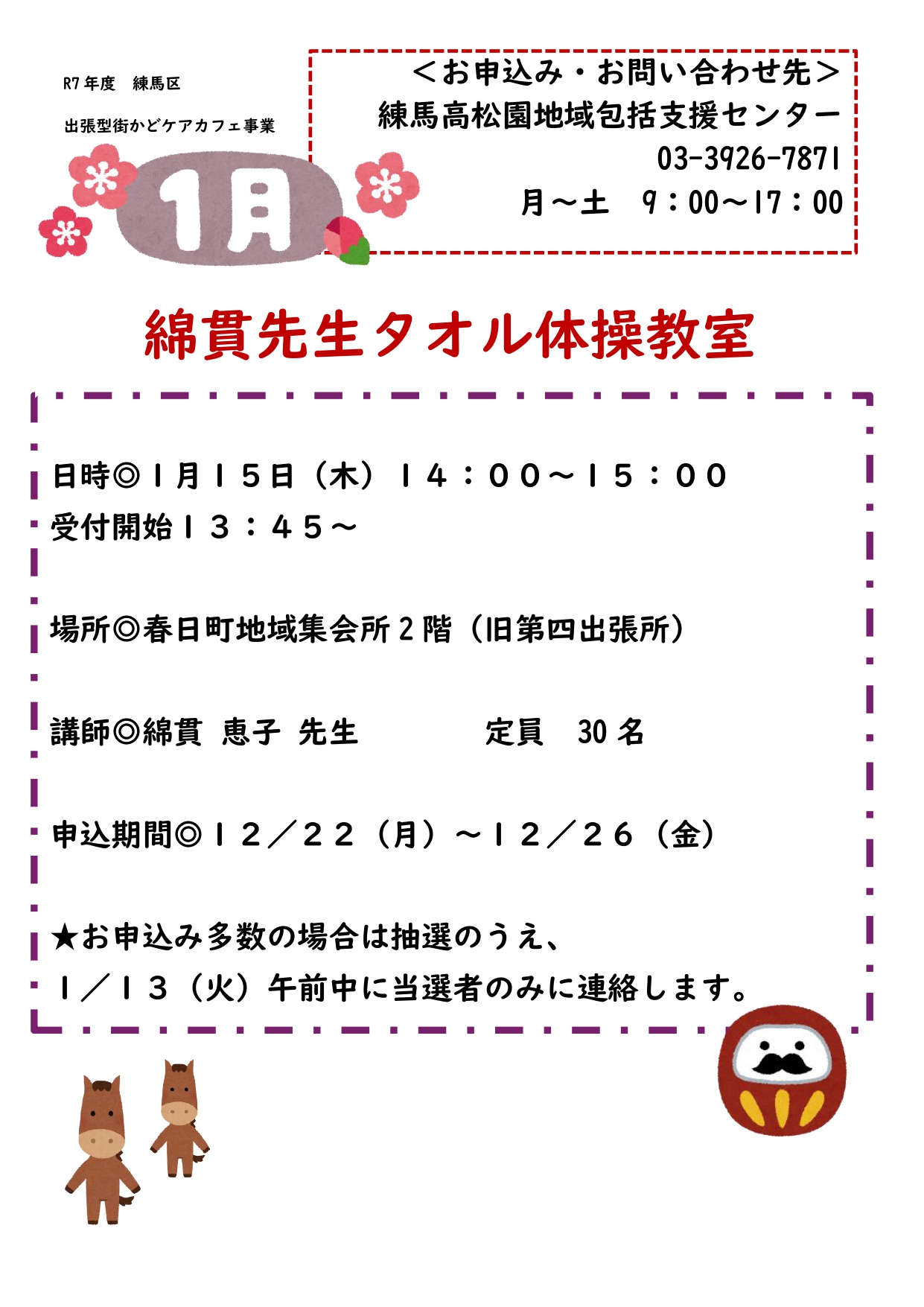 1月8日(木)~1月15日(木)のお申込み期間中に、練馬高松園地域包括支援センターにお申込み下さい。