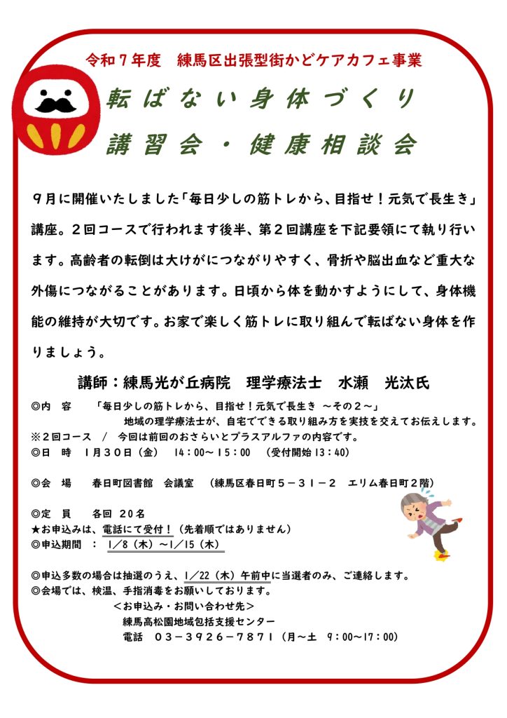 練馬光が丘病院の理学療法士である水瀬光汰先生をお招きし、今年度2回目の「転ばない身体づくり講習会 健康相談会」を開催いたします。