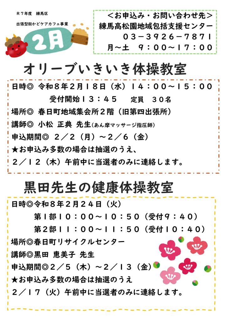2月2日(月)~2月6日(金)のお申込み期間中に、練馬高松園地域包括支援センターにお申込み下さい。