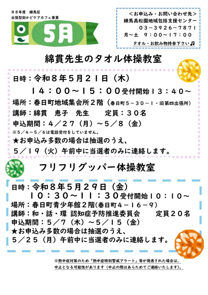 5月7日(木)~5月15日(金)のお申込み期間中に、練馬高松園地域包括支援センターにお申込み下さい。