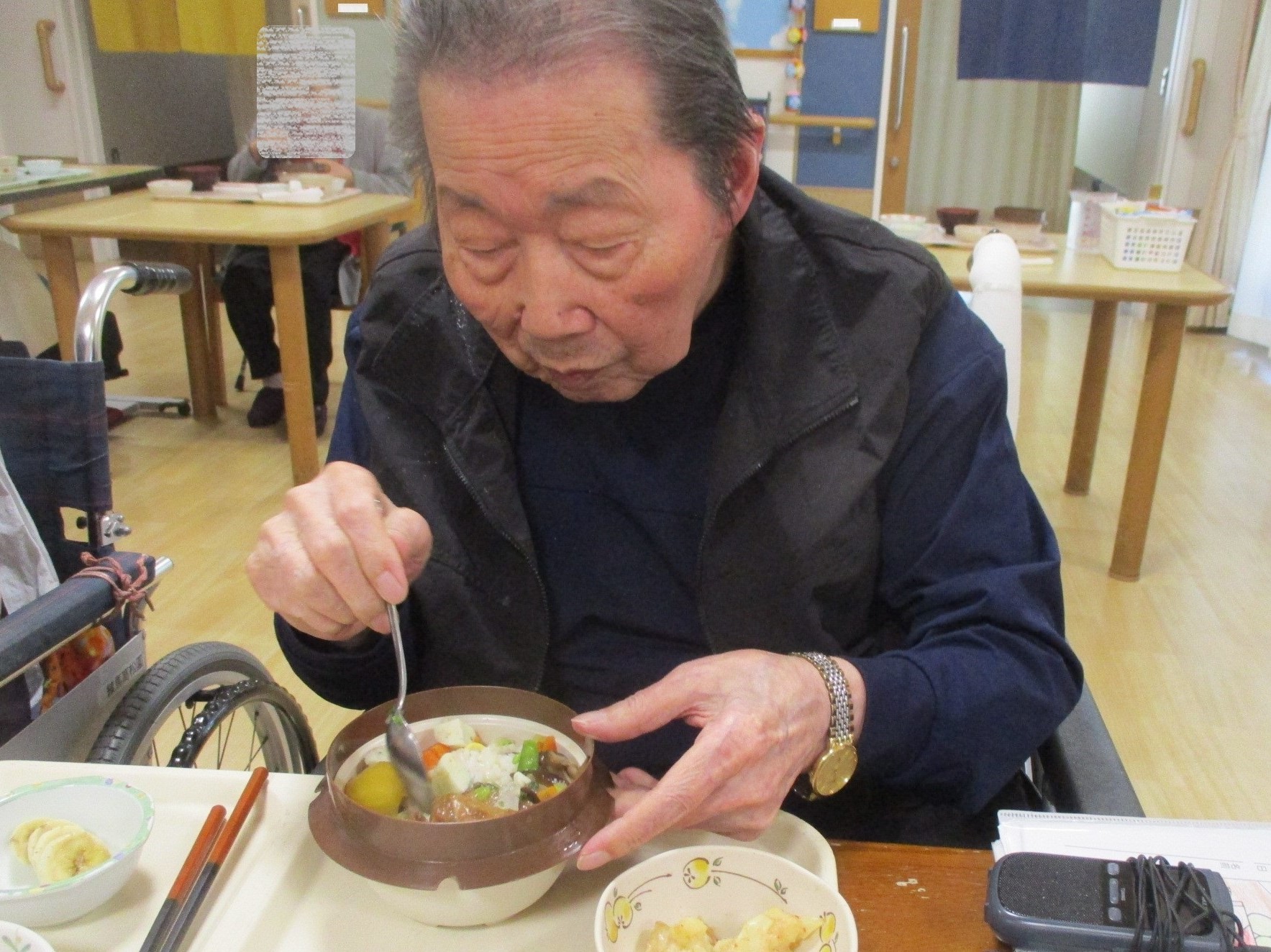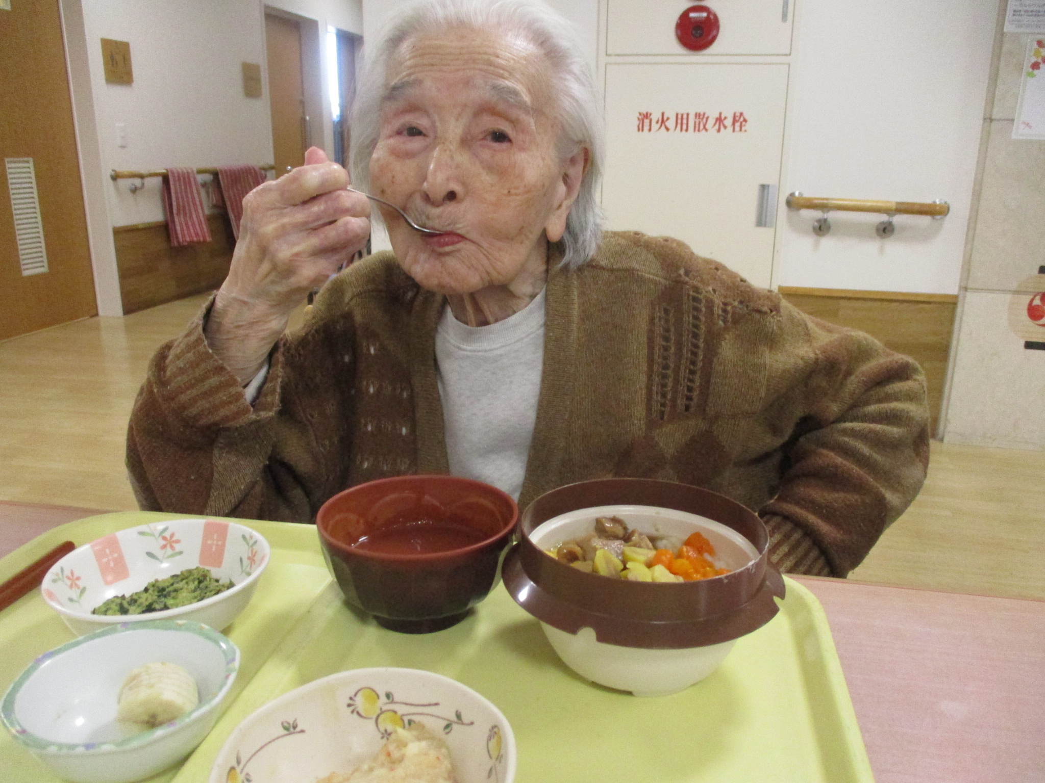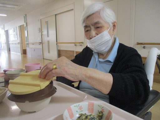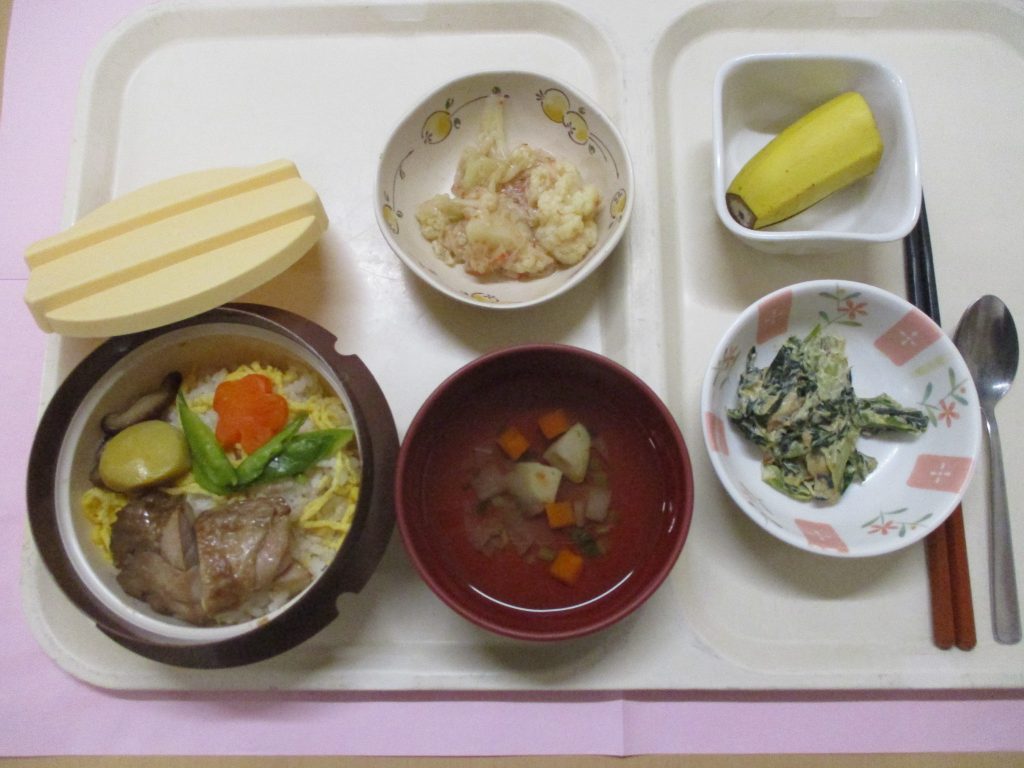11月の季節食は釜めしをご用意しました。 いつもと違う器に皆様とても喜ばれ、 「こういうのもいいね!」「器がかわいい。こんなものあるのね。」 「昔、峠の釜めし食べたよ。」「もう秋ね。」 など釜めしを食べたときのお話や秋の食べ物についてのお話などで 盛り上がりました。 体調を崩さないよう、年末年始を迎えたいと思います。