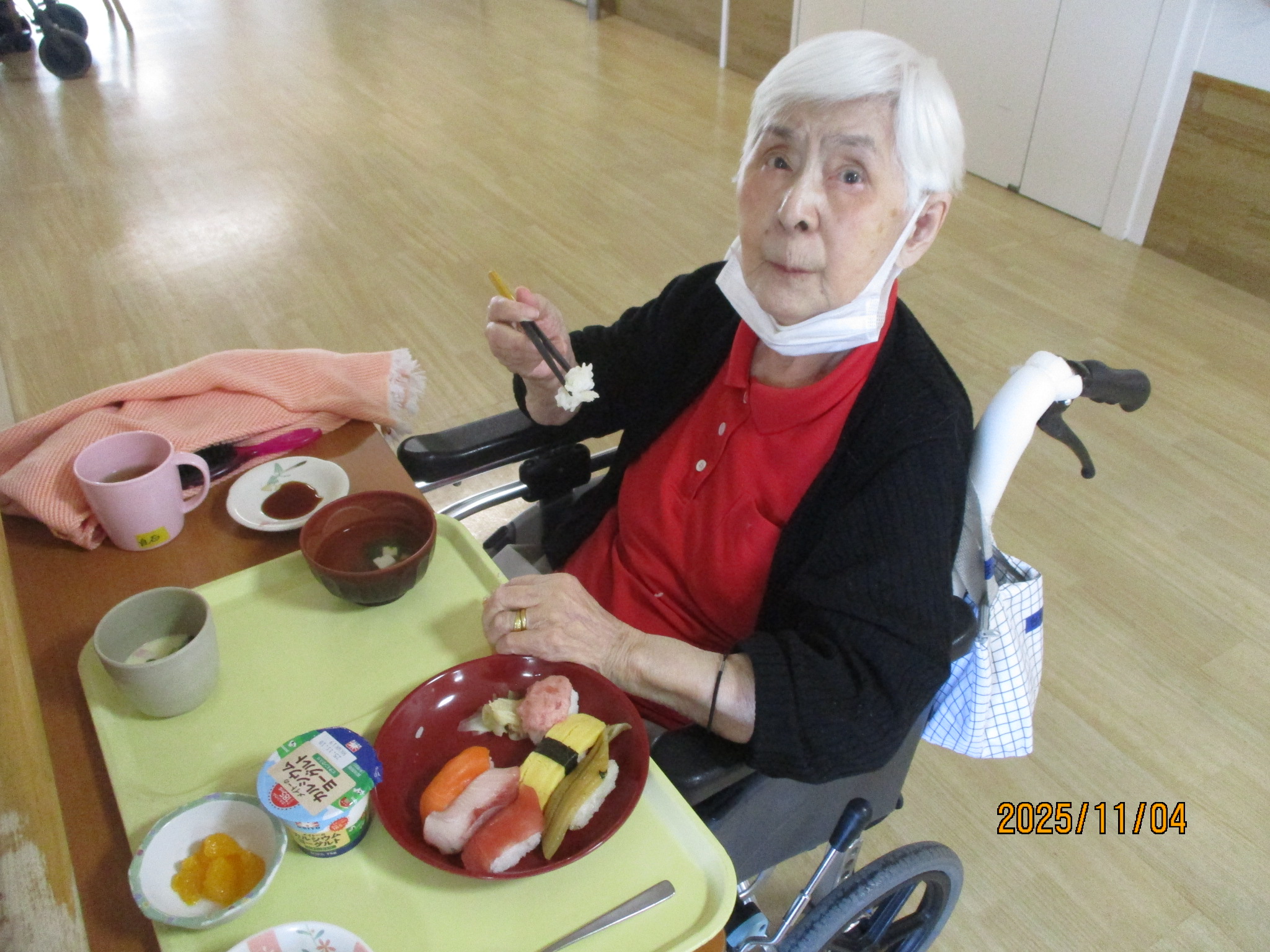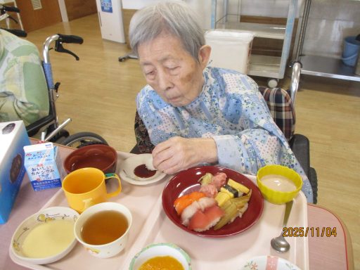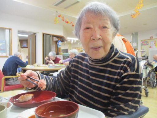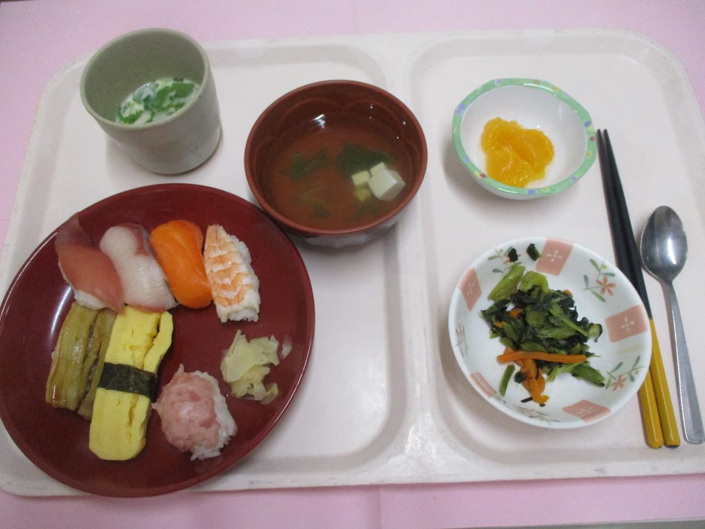 11月の行事食は「寿司御膳」でした。利用者の皆様の人気ベスト3に入る握り寿司です。
