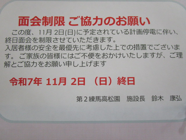 当日は長時間の点検作業であることと、一時的ではありますがエレベーターや照明が使用ができない時間が発生するため11/2(日)の面会を終日中止とさせて頂きます。皆様のご理解ご協力の程宜しくお願い致します。