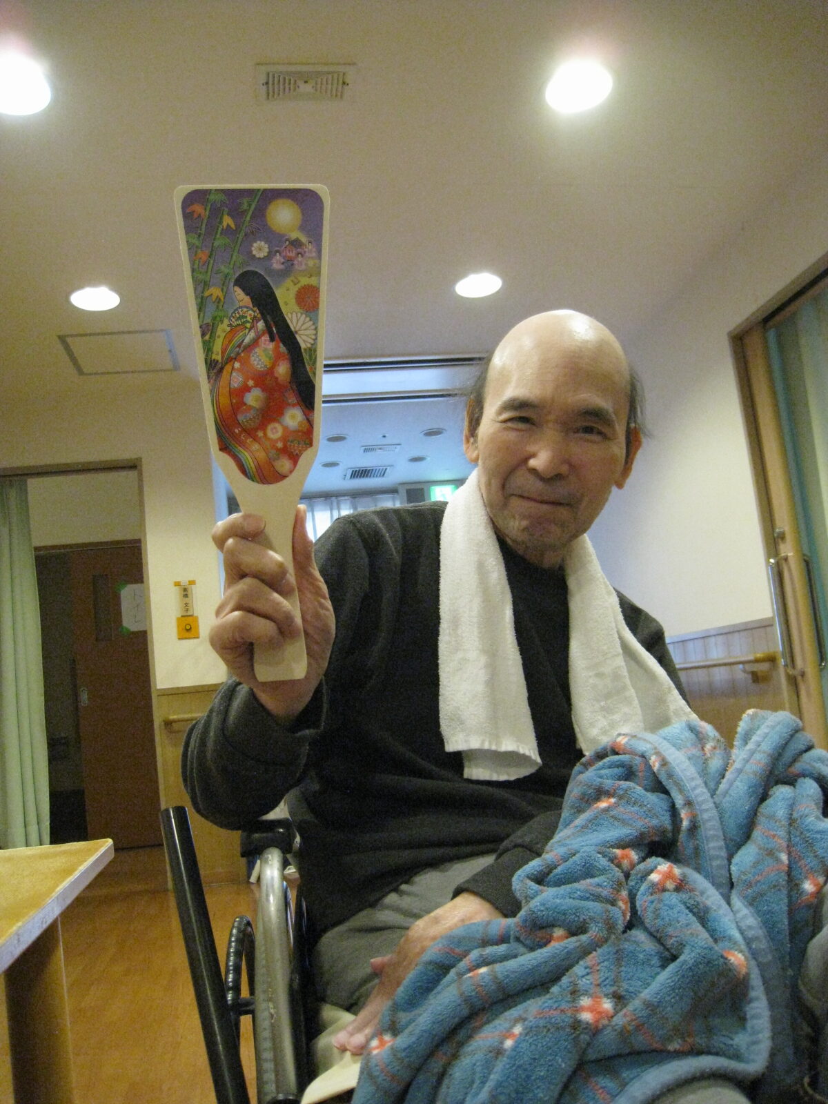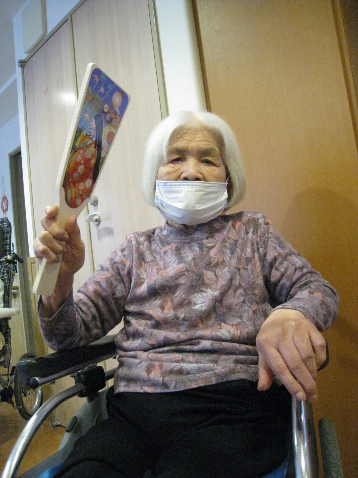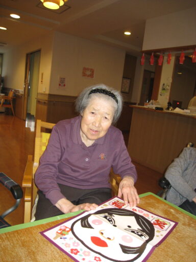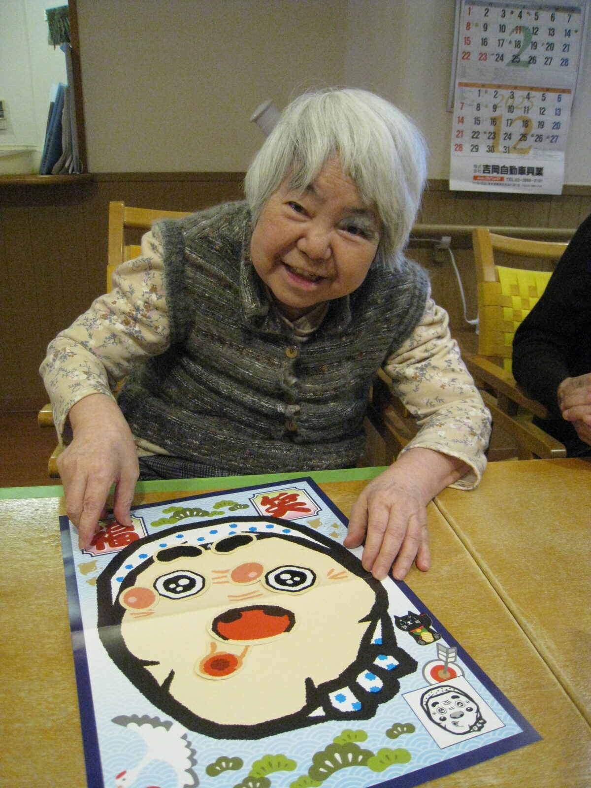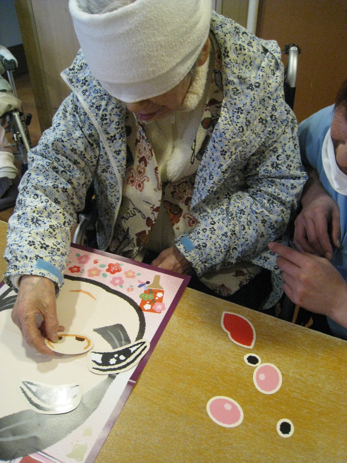 柑子・黄水仙ユニットでは1月のレクリエーションとしてお正月遊びを行いました。 お正月遊びは羽根つき、福笑い、おみくじを用意し皆様に楽しんでいただきました。 「福笑いは難しいわね」、「羽根つきなんて初めてやったよ」、「大吉がひけて嬉しい」、など笑いながらに感想を伝えてくださいました。