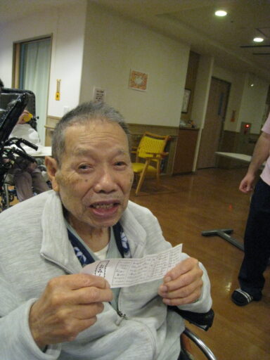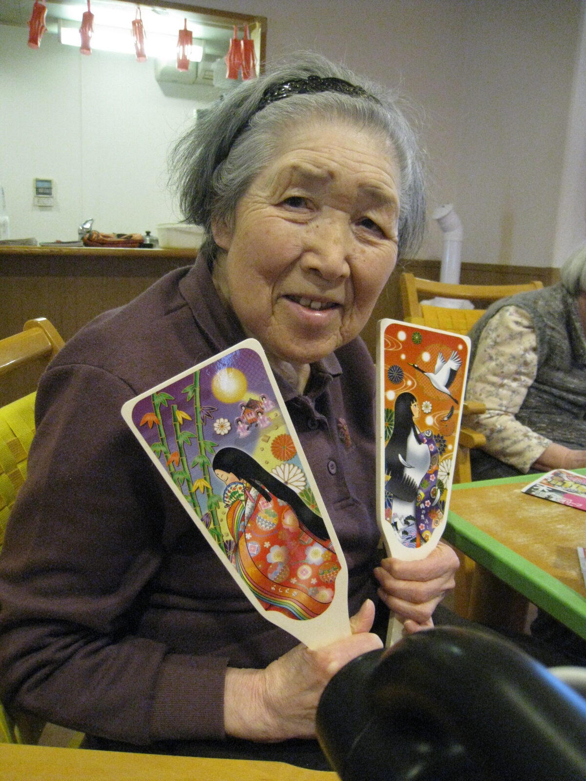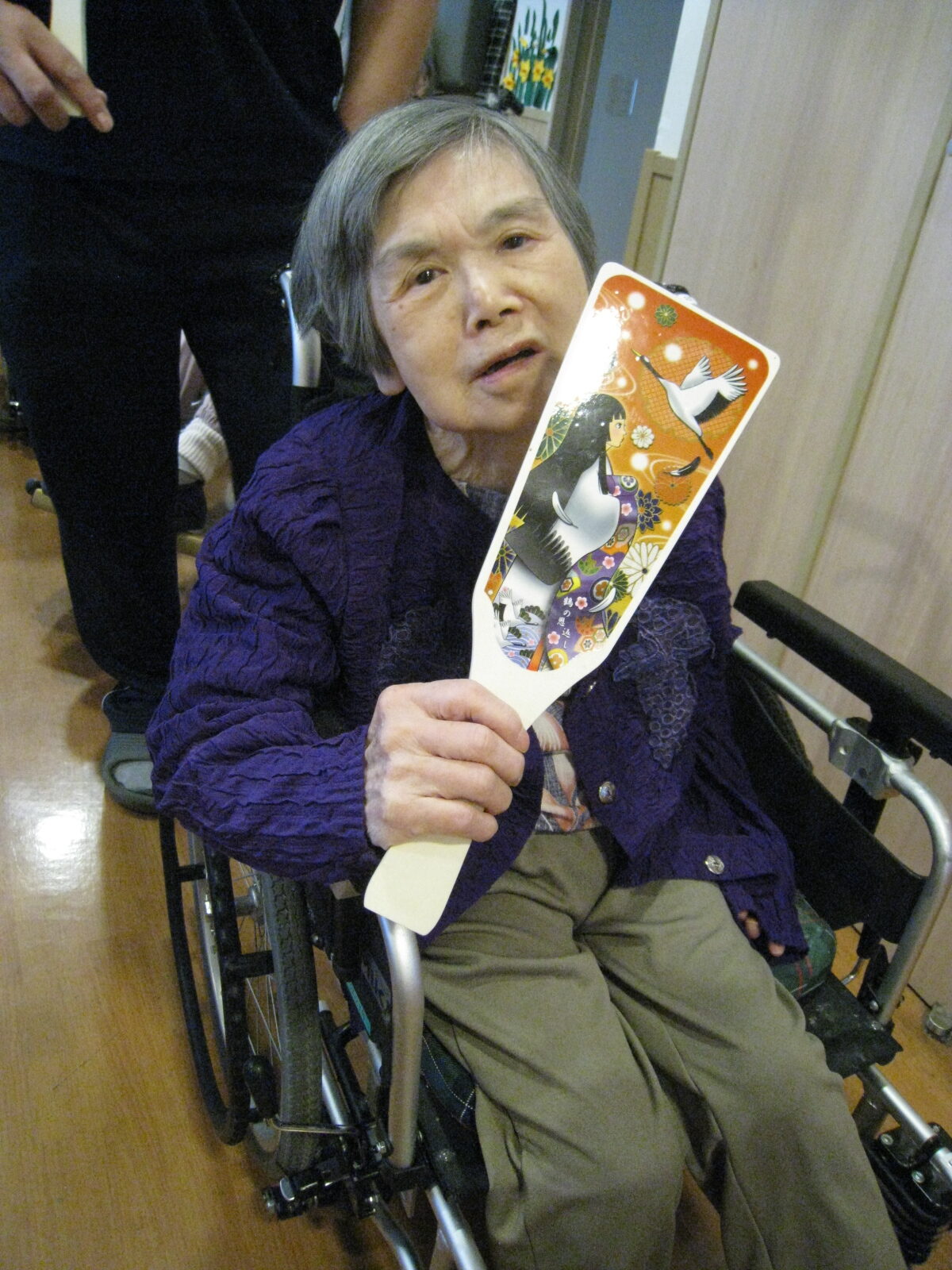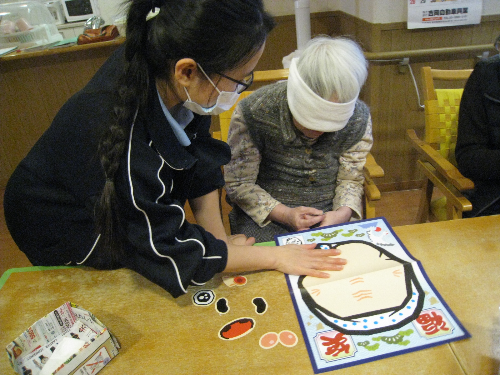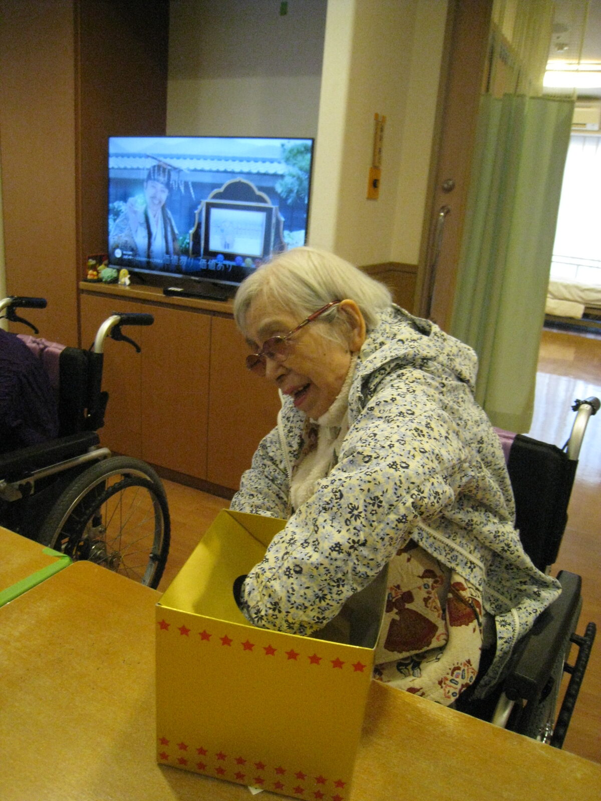 柑子・黄水仙ユニットでは1月のレクリエーションとしてお正月遊びを行いました。 お正月遊びは羽根つき、福笑い、おみくじを用意し皆様に楽しんでいただきました。 「福笑いは難しいわね」、「羽根つきなんて初めてやったよ」、「大吉がひけて嬉しい」、など笑いながらに感想を伝えてくださいました。