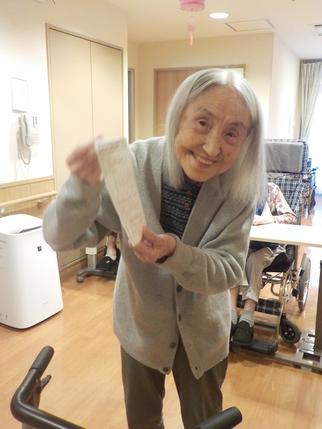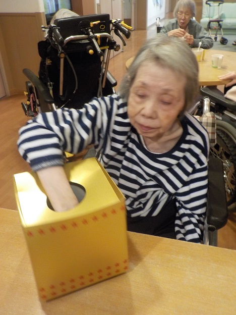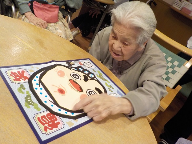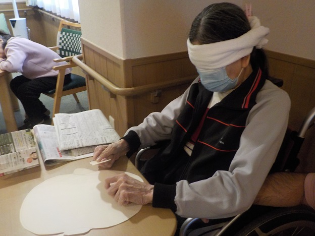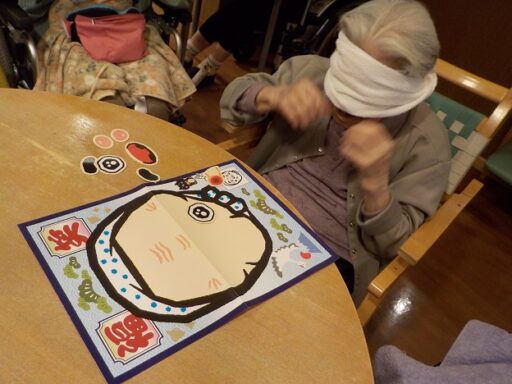 銀若・若竹ユニットでは1月のレクリエーションとしてお正月遊びを行いました。 お正月遊びは羽根つき、福笑い、おみくじを用意し皆様に楽しんでいただきました。 羽根つきでは遊びやすいように風船を使用し、皆さんで輪になって楽しんでいただいたり職員も参加して楽しんでいただきました。 福笑いでは既製品の他に、職員手作りの福笑い2種類を用意し楽しんでいただき、最後におみくじをひいていただきお正月らしい雰囲気を楽しんでいただきました。