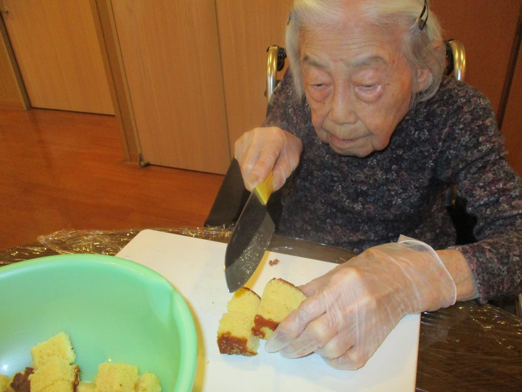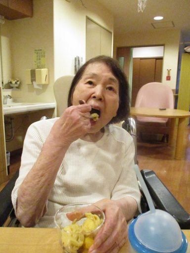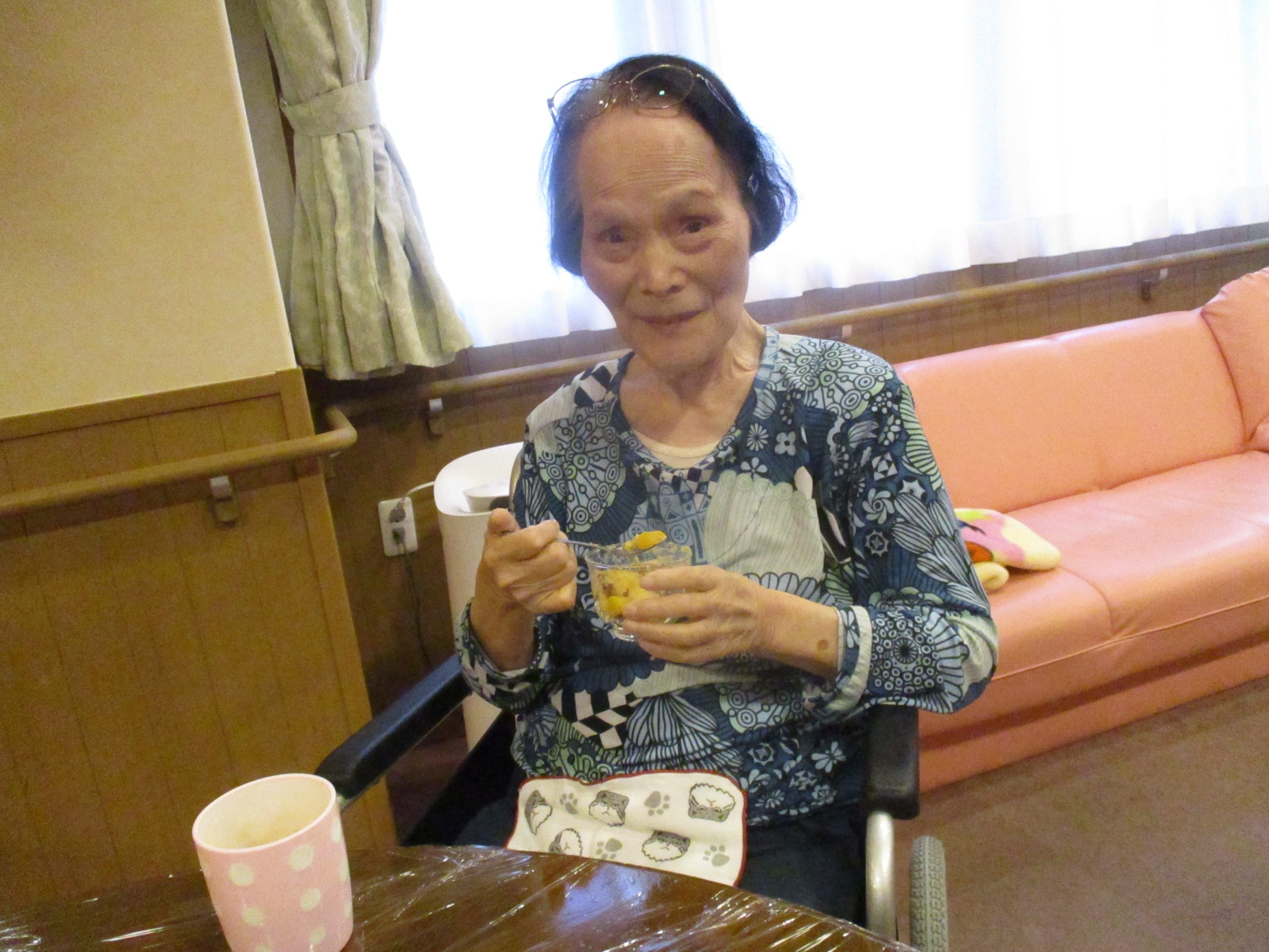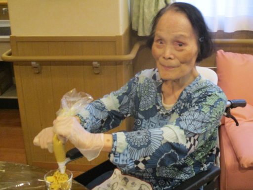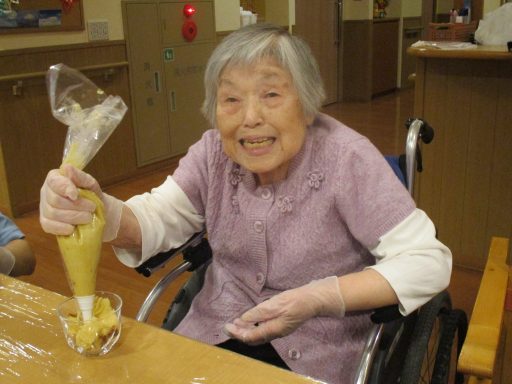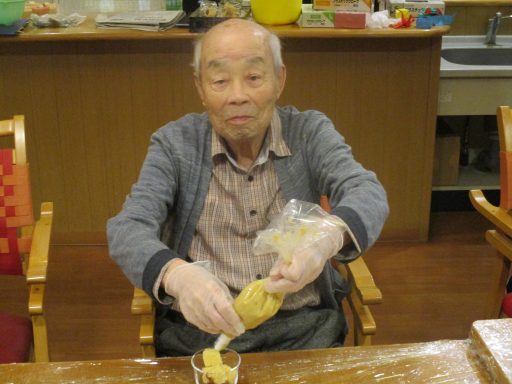 1階の茜・撫子のユニットで焼き芋を使った焼き芋パフェを利用者の皆さんと一緒に作ってみました。 当日は焼き芋を購入し、その焼き芋をミキサーにかけてペースト状にし、カットしたカステラの上に乗せて皆さんに召し上がっていただきました。 男性の利用者様も積極的に手伝ってくださり、みんなでワイワイと楽しく調理をおこなうことができました。焼き芋のペーストの味も良く皆さんに好評でした。
