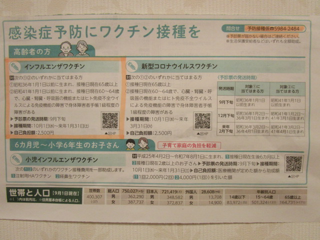 練馬区に住所のある入居者様には区よりインフルエンザワクチンの予診票が届きます。 9月下旬より住民票の住所地へ発送されますのでお早めにご持参をお願いいたします。 上記の画像は「ねりま区報」(令和7年9月21日第2092号)の記事です。ご確認お願いいたします。