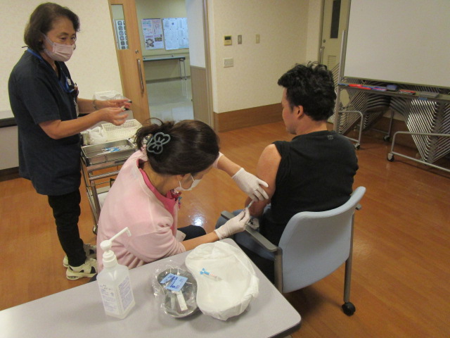 当園の職員を対象にインフルエンザの予防接種を行いました。入居者の方には先月末に希望される方に実施しておりますが、職員には今月から実施をしております。 当園の嘱託医である、たかまつクリニックのスタッフの方に来園していただき注射をしていただきました。 職員の体調を整え、入居者の方々により良いケアを提供し安心して過ごしていただけるよう感染予防に努めてまいります。