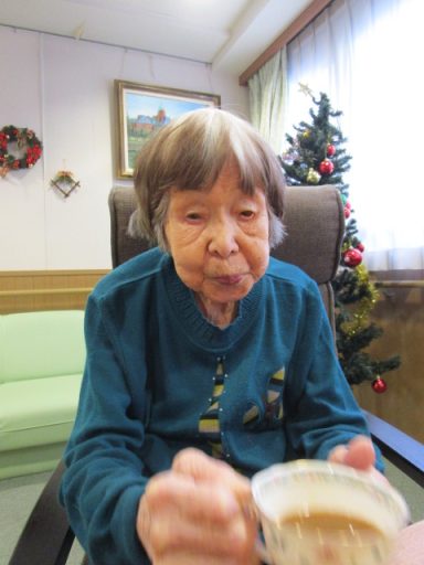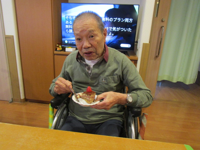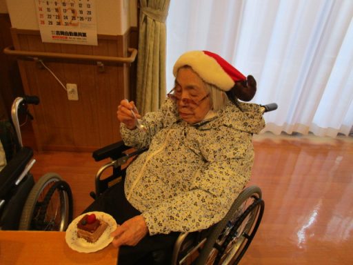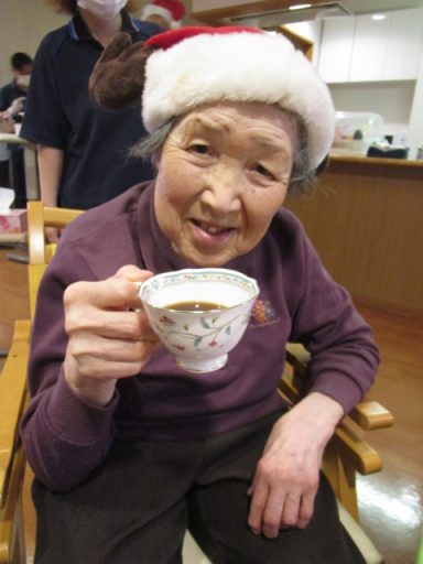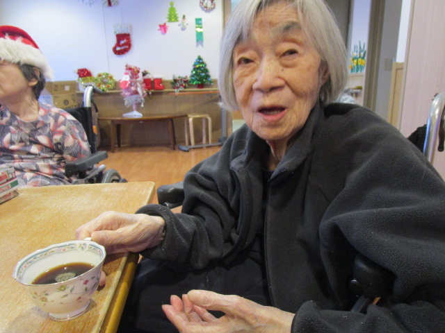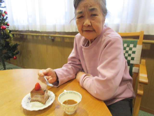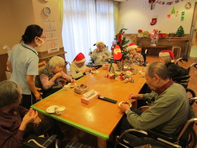 本日、開催した「クリスマスケーキを楽しむ会」の2階の若竹・銀鼠ユニットと柑子・黄水仙ユニットの様子をお伝えします。 2階のユニットでは少し早いですがクリスマスのムードでケーキとコーヒーを楽しんでいただきました。 普段は食が細い方も美味しいケーキとコーヒーにはしっかりご自分で召し上がられました。職員も驚くとともに嬉しく感じております。 これからも皆様に喜んでいただける行事を行ってまいります。