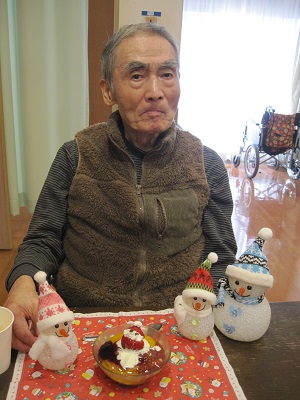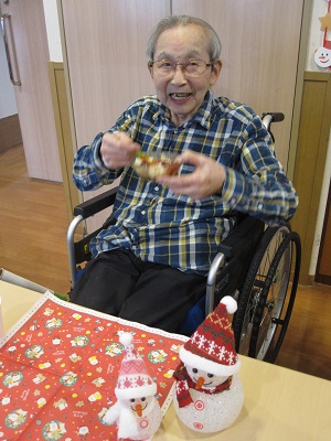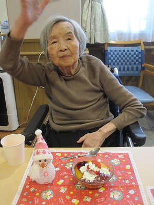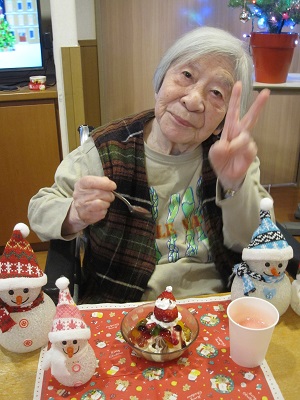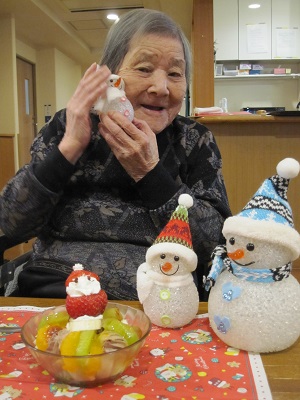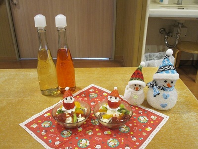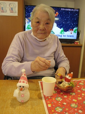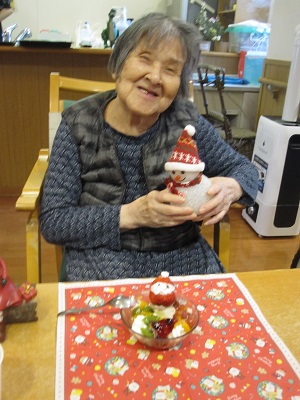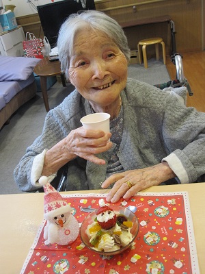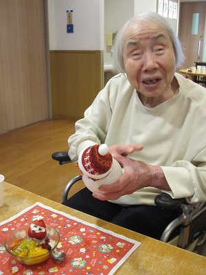 瑠璃・紫苑ユニットではクリスマス会を兼ねて「パーティースイーツを作ろ」のユニットイベントを行いました。 飲み物は子供シャンパンで一年間お疲れさまでしたと入居者様みんなで乾杯をしました。 その後イチゴで作ったサンタさんが乗っているプリンスイーツを召し上がっていただきました。イチゴサンタを見て皆様「食べれるの?」とビックリされていたご様子でしたが「こういうの初めて食べた」と笑顔で話してくださいました。