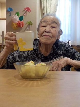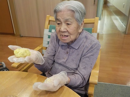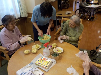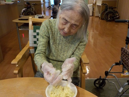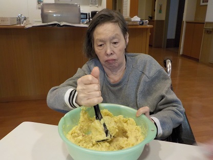 銀鼠・若竹ユニットではサツマイモを使ったおやつ作りをおこないました。 さつまいもをマッシャーで潰したり、成形しアルミカップにのせたりする作業を入居者様にも手伝っていただきました。 トースターで焼き色をつけてチョコスプレーを掛けて召し上がっていただきました。 皆様からは「さつまいもが甘くておいしいね」、「みんなで食べれて嬉しい」などの感想をいただきました。