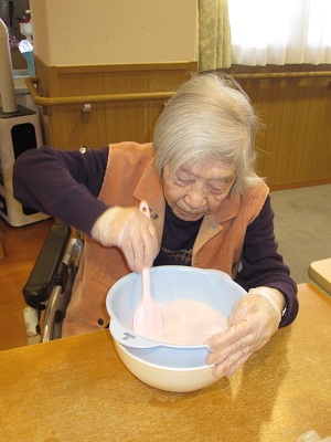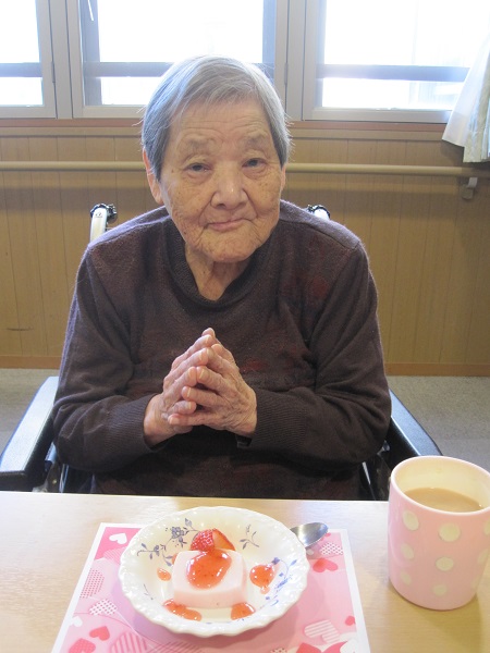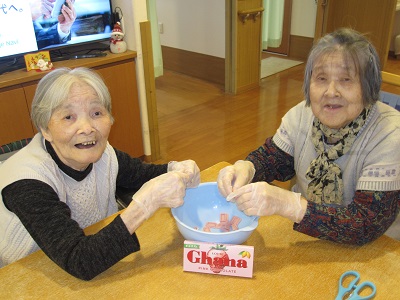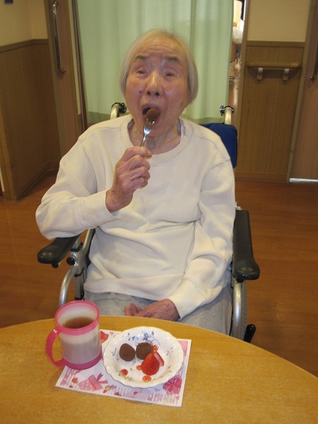 瑠璃・紫苑ユニットではバレンタインデーのレクリエーションとして生チョコといちごプリン作りを行いました。 女性入居者様を中心に午前中から皆さんでワイワイと和やかに作っていただきました。 お昼頃にはデザートの出来上がりが気になり「どんなのかなあ?」と入居者様も職員もソワソワして過ごし、おやつに召し上がられた時は「おいしい~」と大変喜ばれていました。