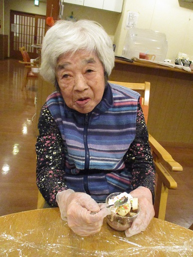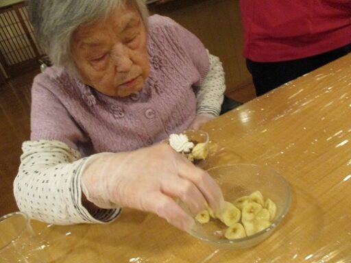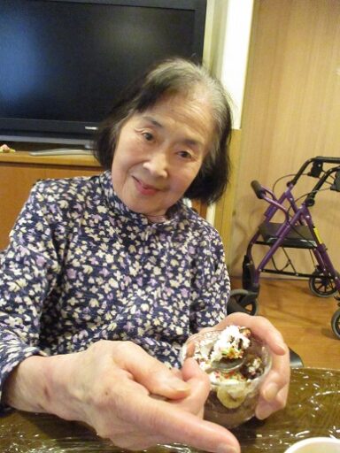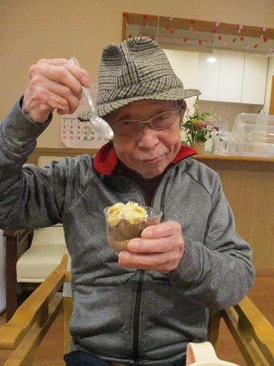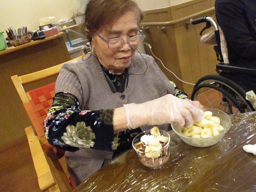 茜・撫子ユニットではバレンタイン企画としてチョコバナナパフェ作りを行いました。 チョコロールケーキとチョコプリンの上に生クリームやカラースプレー、バナナなどを自由にトッピングしてそれぞれオリジナルのチョコバナナパフェを作っていただきました。 「コーヒーによく合う」、「もっと食べたいわ」などと好評でした。また、ショートステイの利用者様からは「ここはいつも色々やってくれるから来るのが楽しみ」とお褒めの言葉もいただきました。