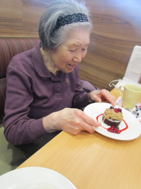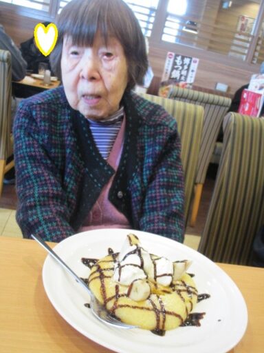 2階の4ユニットの入居者様数名を近所のファミリーレストランへお連れしデザートを食べてきました。皆さま出発前から楽しそうなご様子で、店内ではメニューをゆっくりと見ながらお好きな物を選ばれ、美味しそうに召し上がられ笑顔で当園に戻ってこられました。