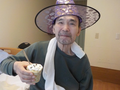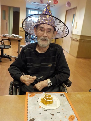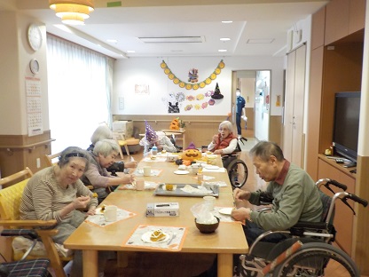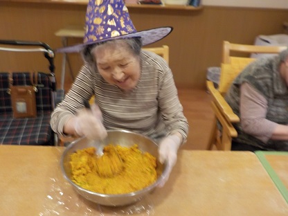柑子・黄水仙ユニットではカボチャを使ったスイーツ作りでハロウィンを楽しみました。 茹でたカボチャをつぶし、バターやハチミツを混ぜてミニパンプキン型に整えてから焼き上げるおやつを作りました。 カボチャの甘味もしっかり味わえて男性入居者の方々にも好評で楽しいハロウィンになりました。