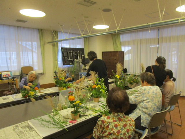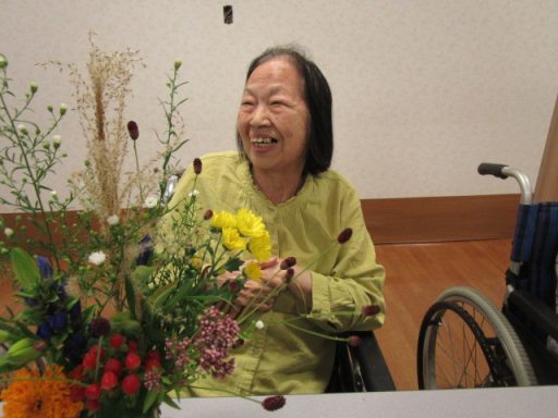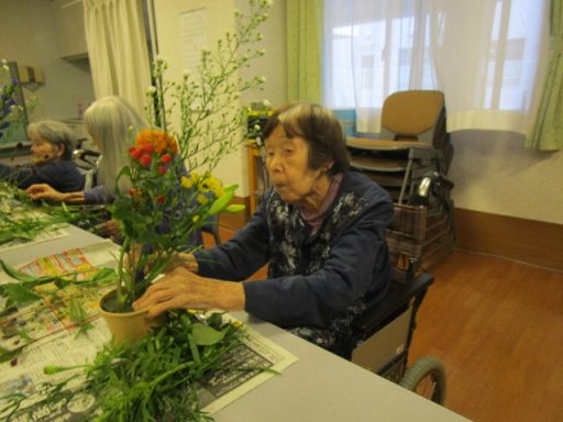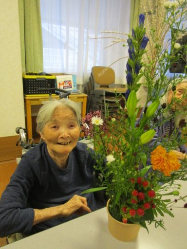 今月のフラワーアレンジメントも特養の方、ショートステイの方、たくさんの皆様に楽しんでいただきました。 今月のお花は【くじゃくそう】、【すすき】、【りんどう】、【百合】、【ヒペリカム】、【マリーゴールド】、【フジバカマ】、【菊】、【ワレモコウ】を生けていただきました。 本日の参加者の皆様は長く時間をかけてじっくりと生けていらっしゃったのが印象的でした。花を生けながら昔の話をされたりとリラックスした時間を過ごされました。