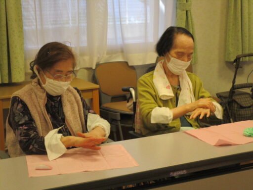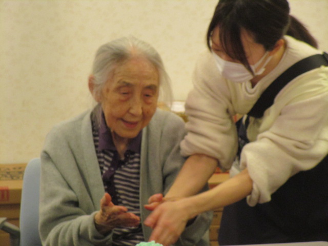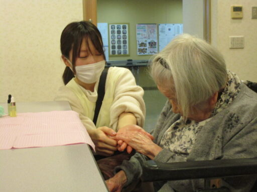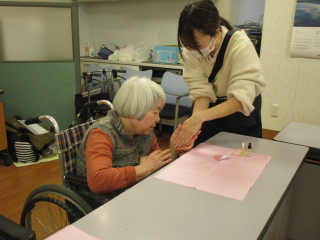 いつもお世話になっている介護美容の専門スクールである介護美容研究所様から学生の方に美容レクリエーションとしてハンドトリートメントを行っていただきました。