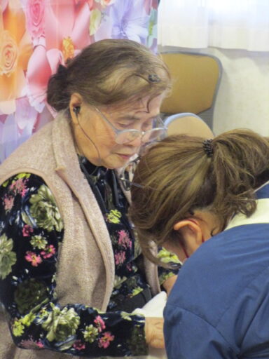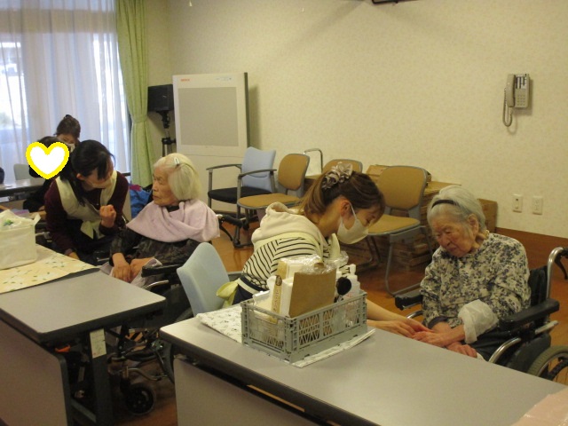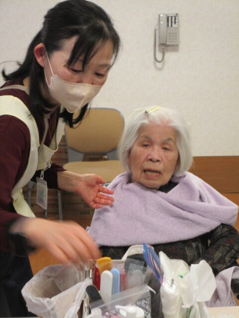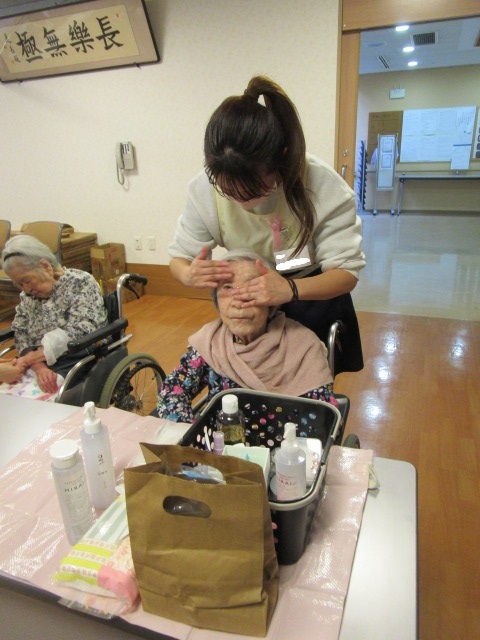 いつもお世話になってる介護と美容それぞれの業界で必要となる知識や技術を学ばれている介護美容研究所の学生さんが今週も来園されました。 本日は特定のご利用者様へ定期的に同じ受講生が提供する介護美容がその方へどのような身体的・精神的な変化を与えるのかというアセスメントプロジェクトの最終日でした。 他に数名の利用者様にフェイシャルケア、ハンドトリートメントを行っていただきました。施術を受ける前から「私も是非やってほしい!」と希望される方もいらしゃるなど大人気でした。
