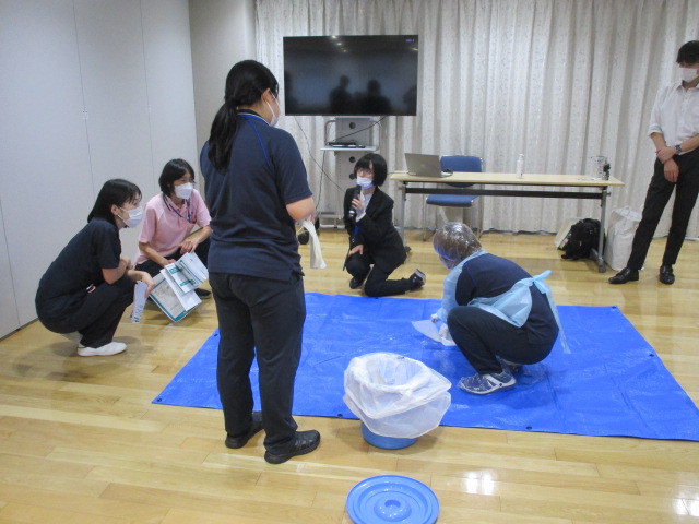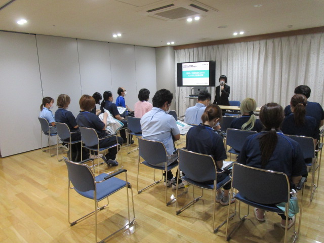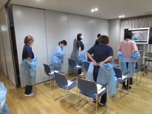 東京福祉会高齢部門では年間でスケジュールを組んで定期的に感染症に対する研修を開催しております。 6月の感染症研修に続き、今回の研修でも花王プロフェッショナルサービス様から講師の方をお招きして「ノロウイルス感染対策」というテーマでお話ししていただきました。 講義以外でも実技としてガウンテクニックと汚物処理の指導をしていただきました。今後も感染症対策に努めてまいります。