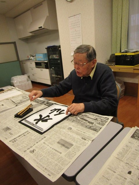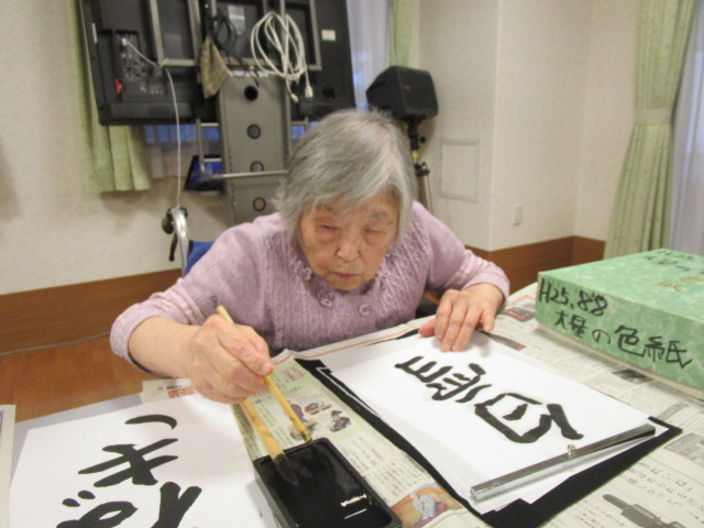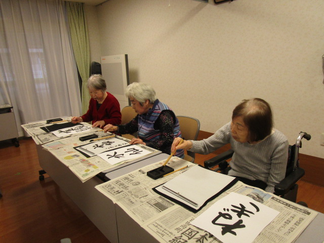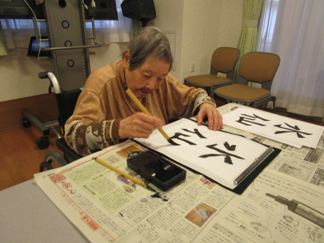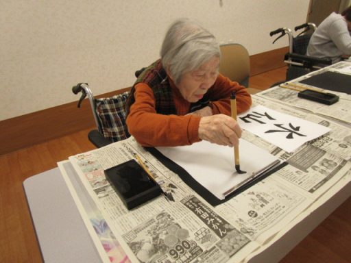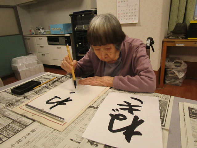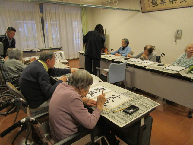 今月の書を楽しむ会は「水仙」、「ねぎ」、「聖夜」、「サンタ」、「白雪」、「寒風」のお手本の中からお好きな文字を選んで書いていただきました。 今年もあっという間に過ぎ、あと一か月になりました。今月はショートステイの利用者の方がたくさん参加していただけました。 「聖夜なんて難しくて書けないわよ」、「久しぶりにお習字して楽しかった」などと話しながら、思い思いに楽しい時間を過ごされました。