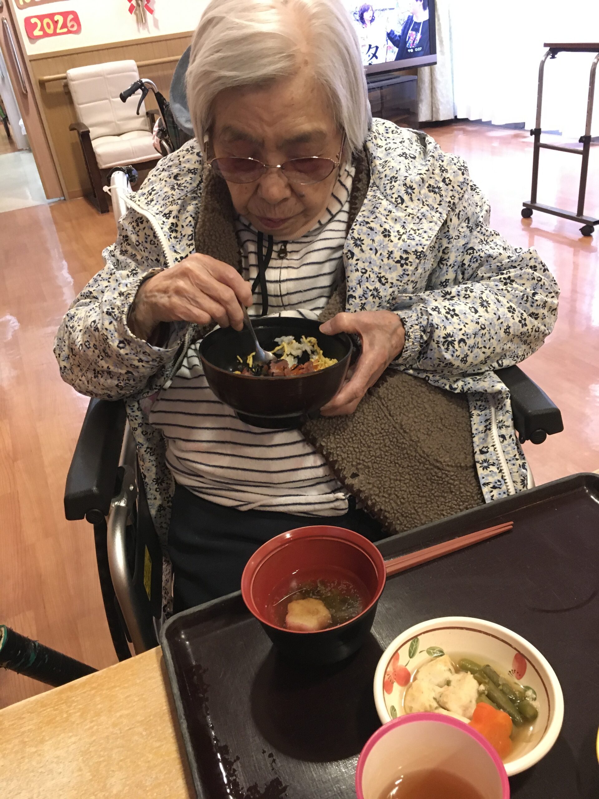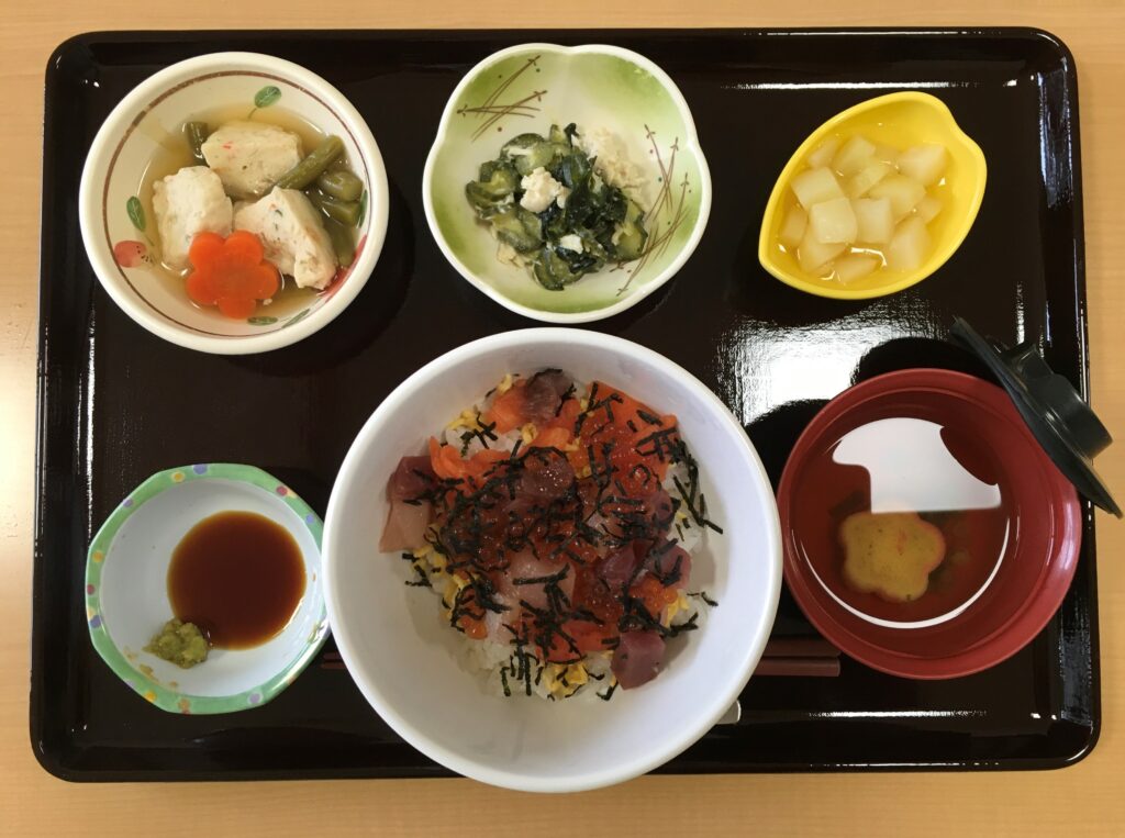 本日3月3日は「桃の節句」の行事食、 メニューは彩り豊かなちらし寿司です。 丼ごはんの上に細かくカットしたお刺身がちりばめられ、 「きれいだね。」「春らしいわ。」との声が聞こえてきます。 いつもより少し量が多いお食事も皆さましっかりと召し上がって おられました。 ◇◇◇◇◇◇◇◇◇◇◇◇◇◇◇◇◇◇◇◇ ・海鮮ちらし ・炊き合わせ ・胡瓜と帆立の酢味噌和え ・清汁 ・白桃缶 ◇◇◇◇◇◇◇◇◇◇◇◇◇◇◇◇◇◇◇◇
