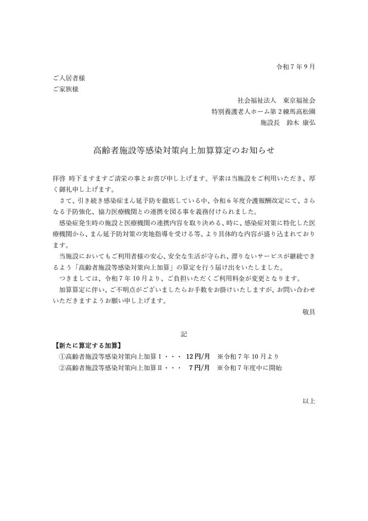 つきましては、令和7年10月よりご負担いただくご利用料金が下記の通り変更となります。加算算定に伴い、ご不明点がございましたらお手数をお掛けいたしますが、お問い合わせいただきますようお願い申し上げます。