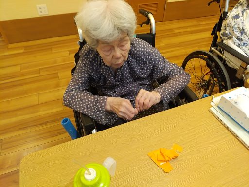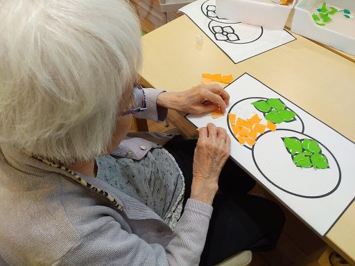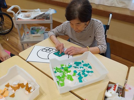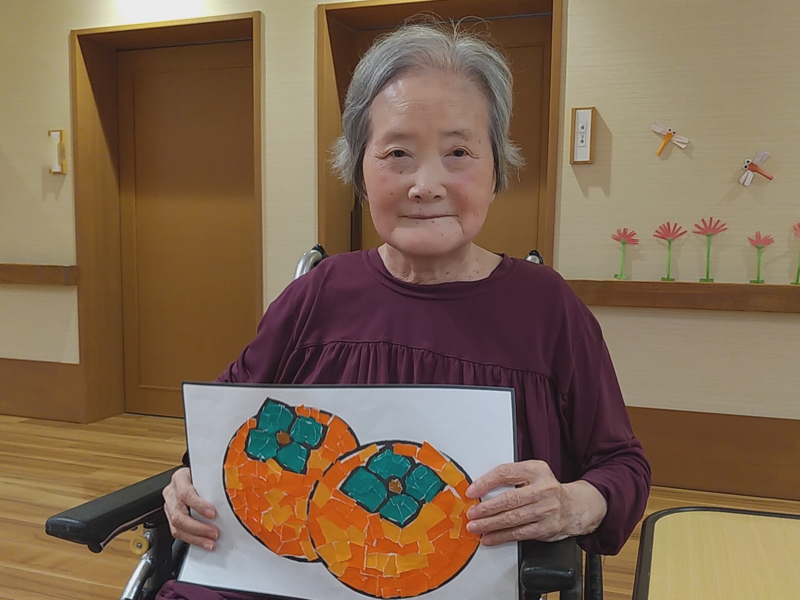 ちぎった色紙で色を付ける「ちぎり絵」の作品作りを行いました。 秋ということで果物の「柿」に色付けしました。 職員がのり付けしたところに色紙を貼っていただきました。 テンポ良く貼っている方や枠内に収まるよう慎重に貼られている方もおり 中には「見てるだけでいいの。」と 色紙ちぎりをひたすら手伝ってくださる方もおりました。 でき上がった作品を見ると個々でちがうものとなりました。