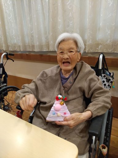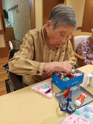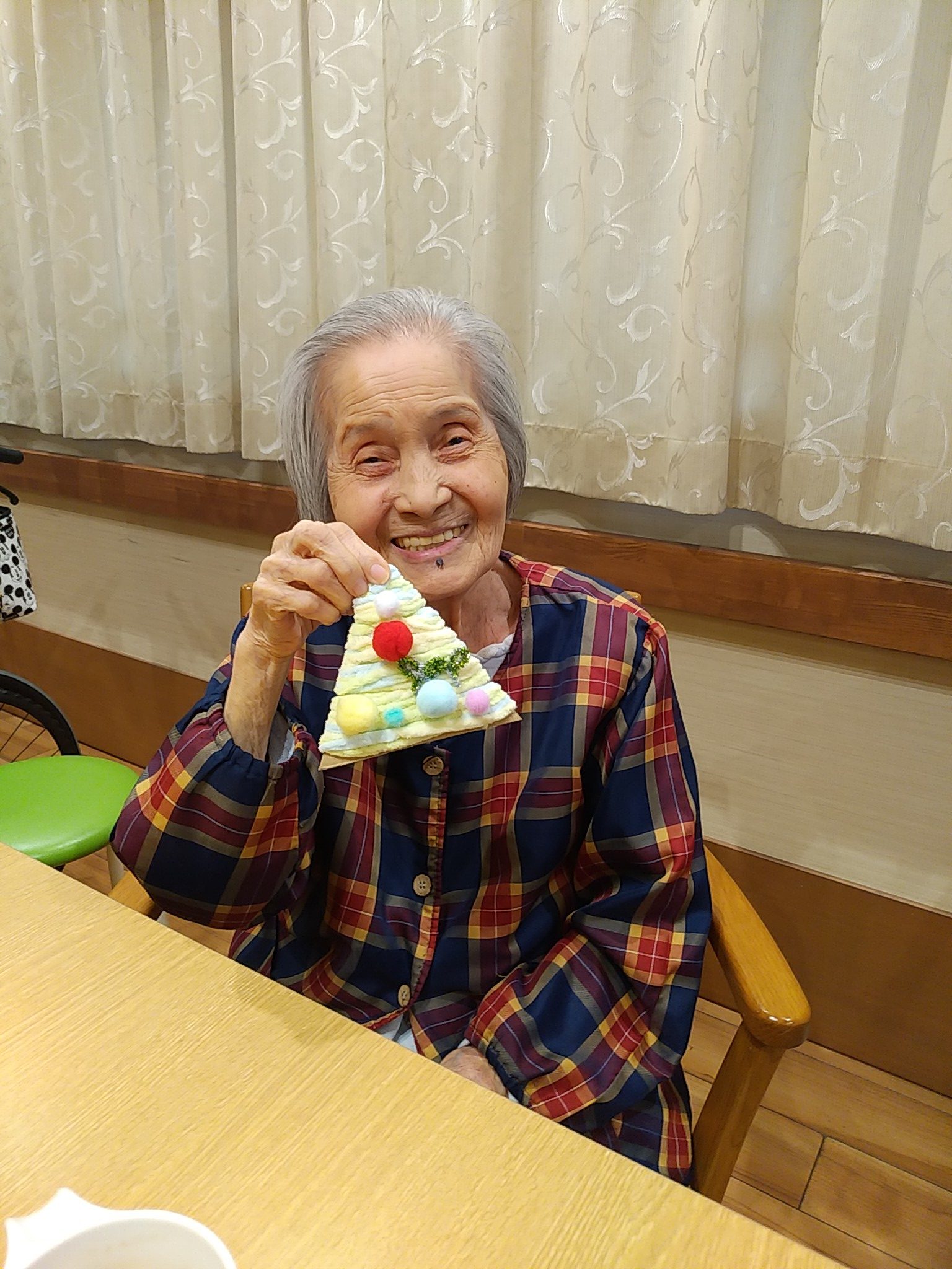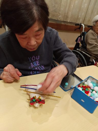 こちらのユニットでは「クリスマスツリー」を作っていただきました。 三角の段ボールにピンク色や黄緑色の毛糸を巻き付け、 様々な種類の飾り付けを行いカラフルなツリーが出来上がりました。 作業中は皆様集中して取り組んでおり、 出来上がった作品を見ると自然と笑顔が見られました。