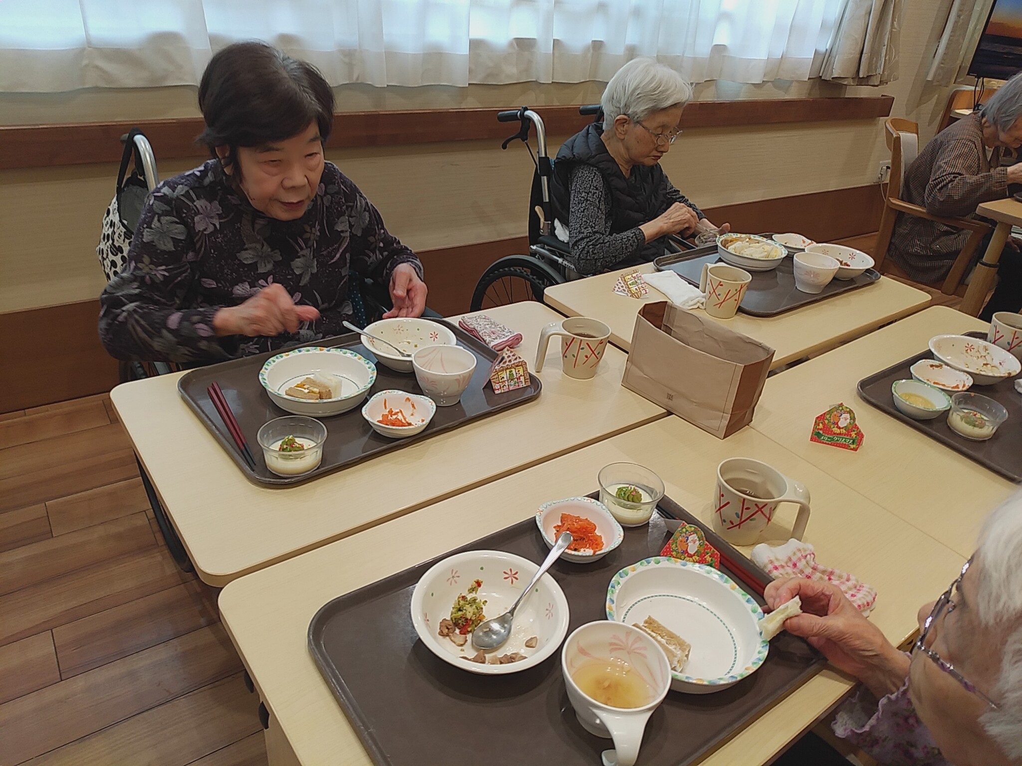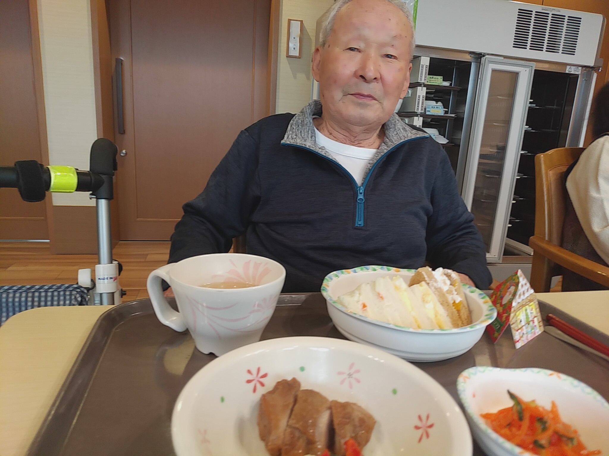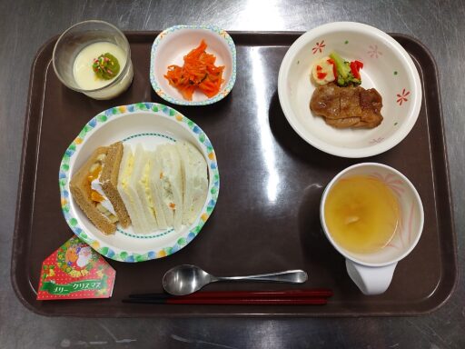 12月24日にクリスマスメニューでは「サンドイッチ」の提供を行いました。 サンドイッチの具材は「たまごサラダ」「ポテトサラダ」 「みかんとバナナのフルーツサンド」の3種類でした。 手に持って食べやすいのでサンドイッチを最初に食べている方が多かったご様子です。 中でも特にフルーツサンドが喜ばれておりました。 パン粥の方はコーヒー牛乳で作ったパン粥に チョコレートソースをかけて召し上がっていただきました。 デザートはクリスマスツリーをイメージして作っています。
