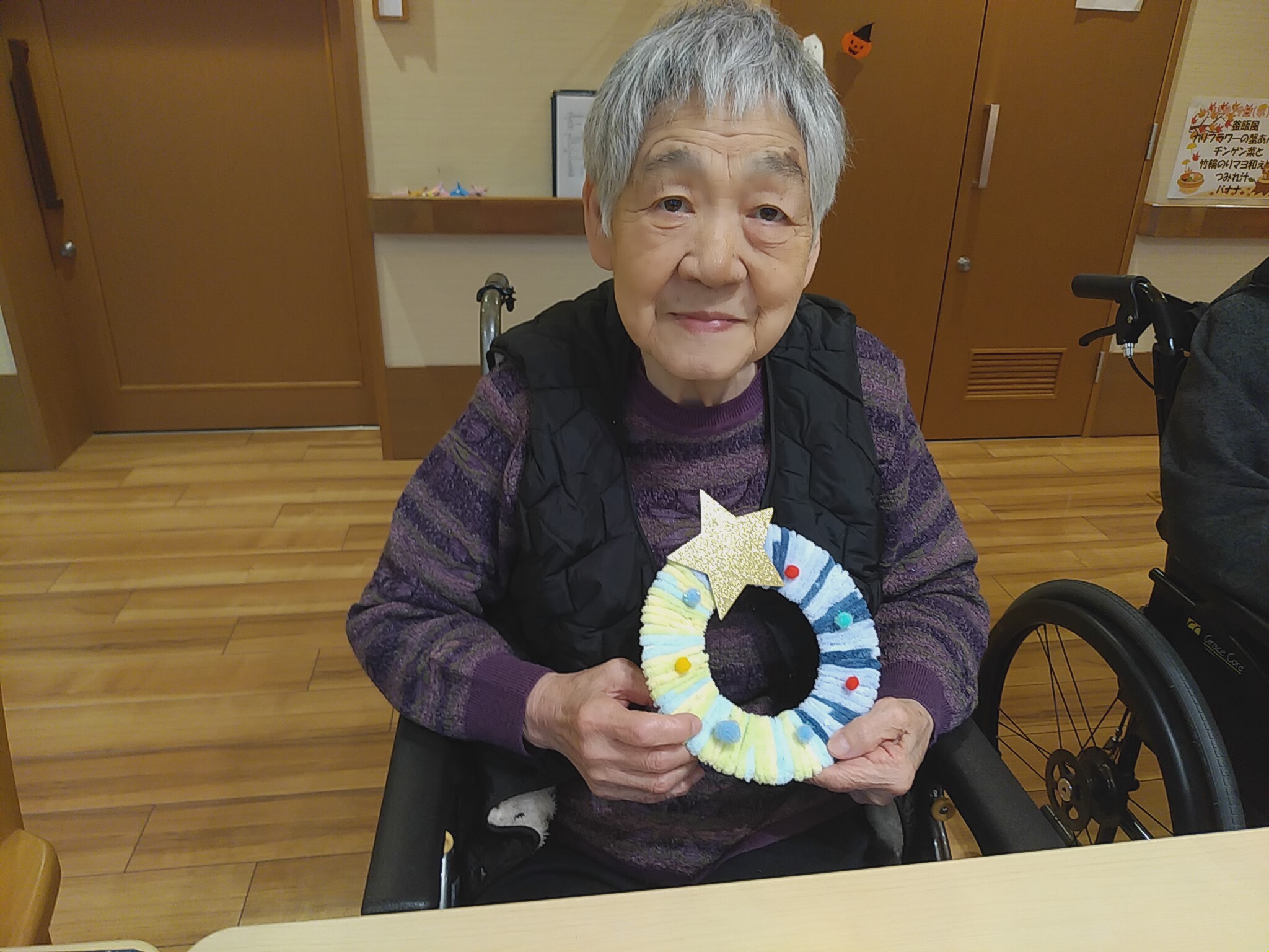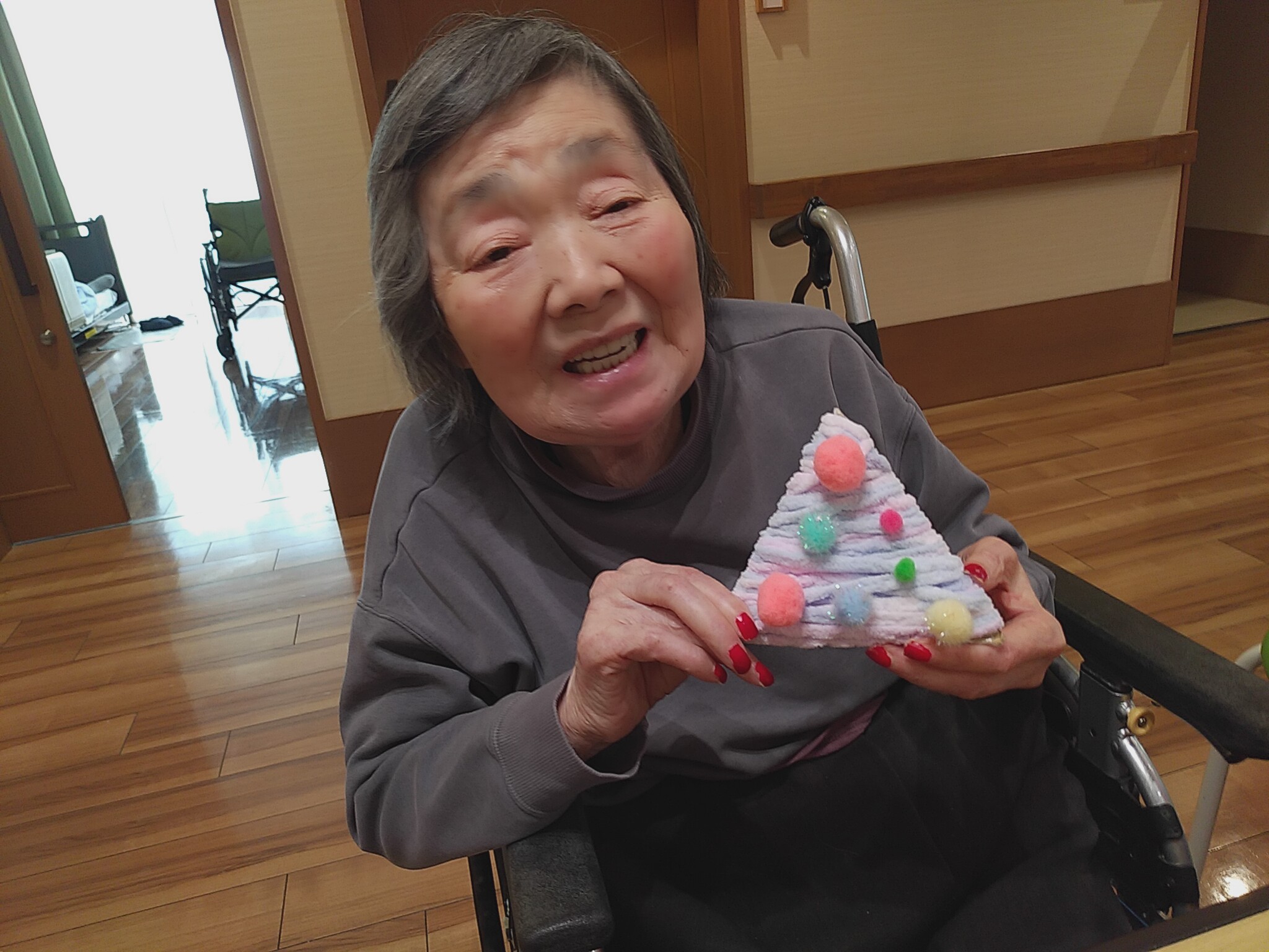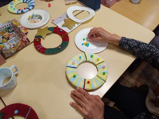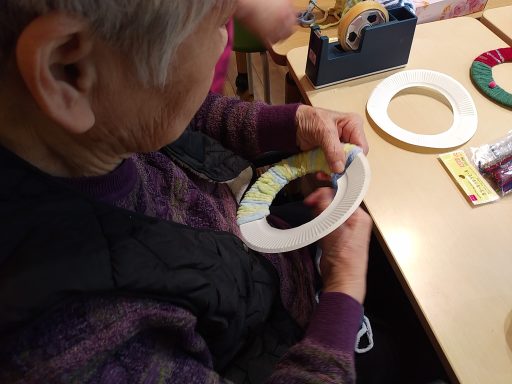 クリスマスに向けて「クリスマスリース作り」を行いました。 真ん中を切り抜いた紙皿にカラフルな毛糸を巻き付けた後は 色とりどりの飾り物を付けました。 ショートステイご利用中の方にも手伝っていただき あっという間に素敵なリースが出来上がりました。 出来上がったリースを見て「かわいいわね~」と 皆様嬉しそうにされておりました。 また、三角形に切り抜いたダンボールで クリスマスツリーも作っていただき こちらも素敵な作品となりました。