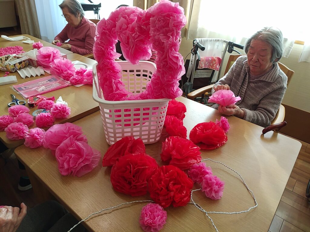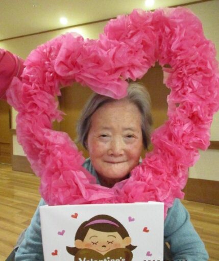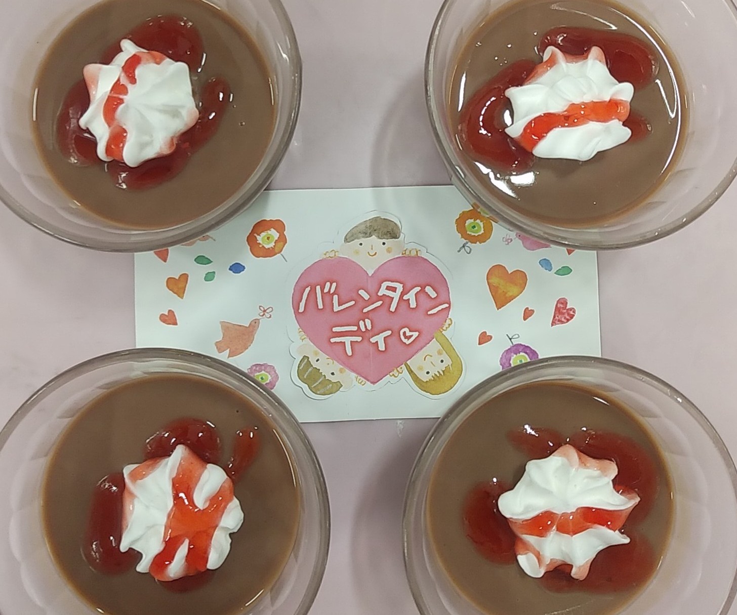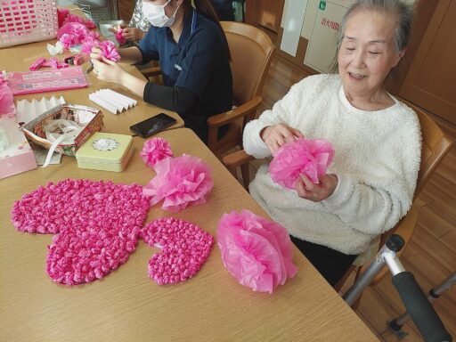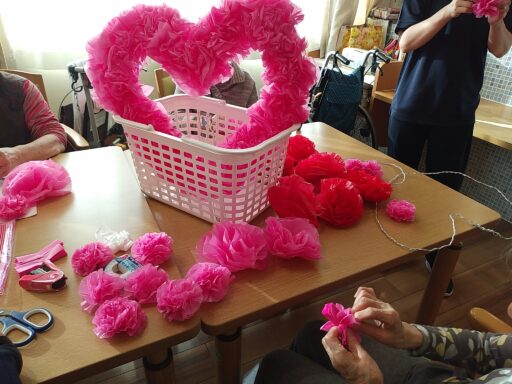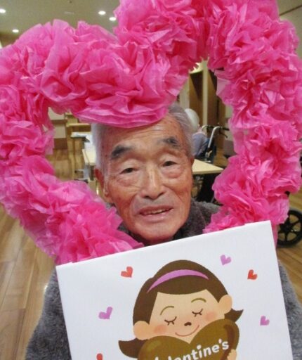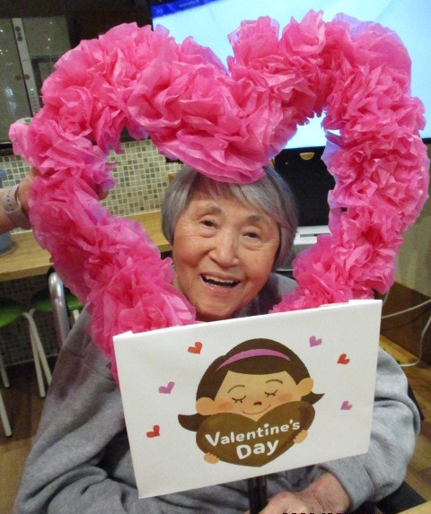 2月14日はバレンタインデーということで ショートステイのご利用者様とお作りした ハートの飾りと一緒に記念撮影を行いました。 当日のおやつは「チョコレートババロア」を提供しました。