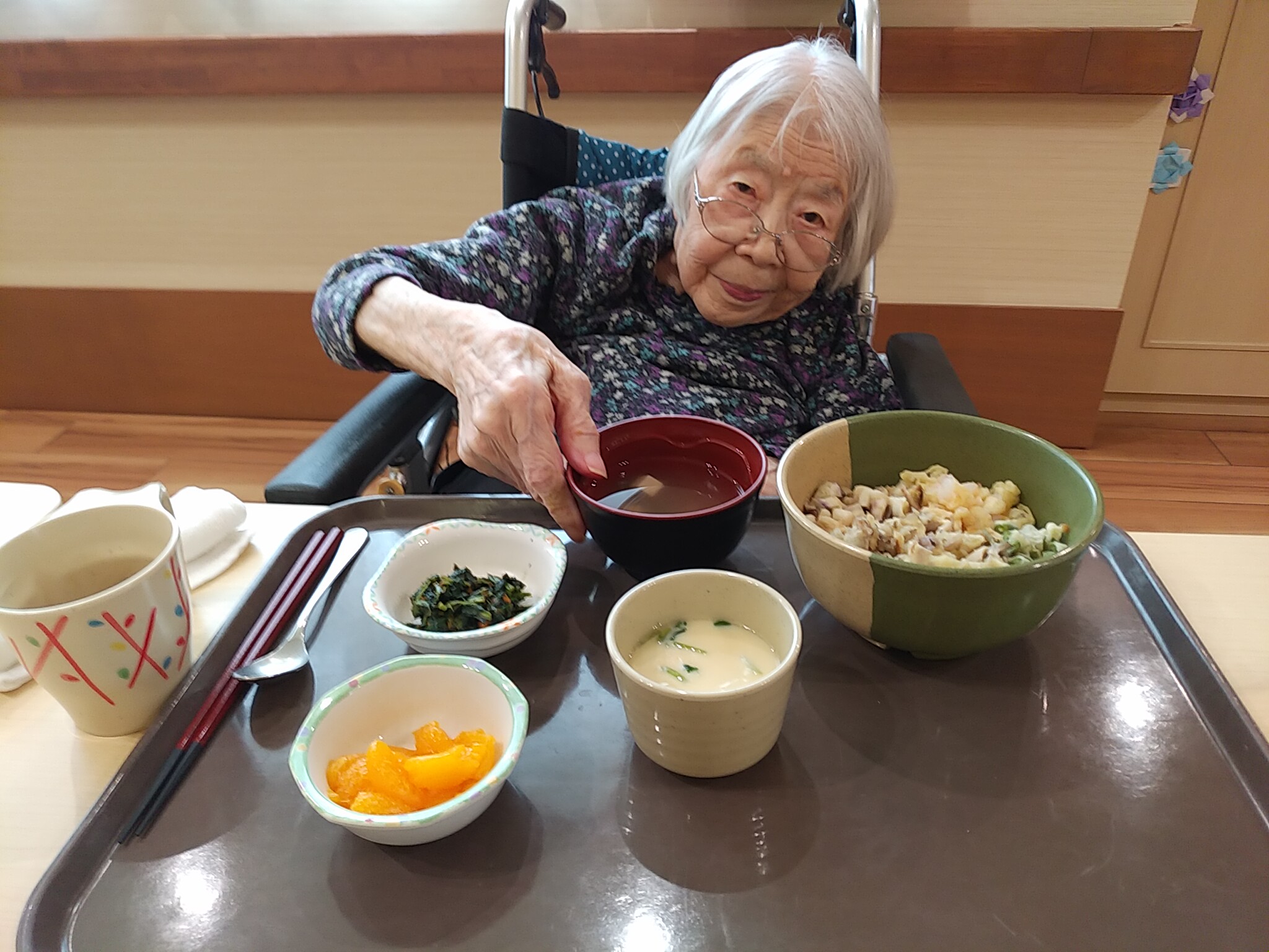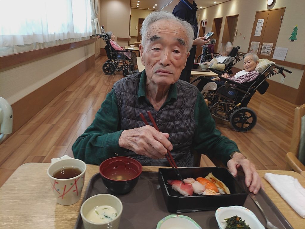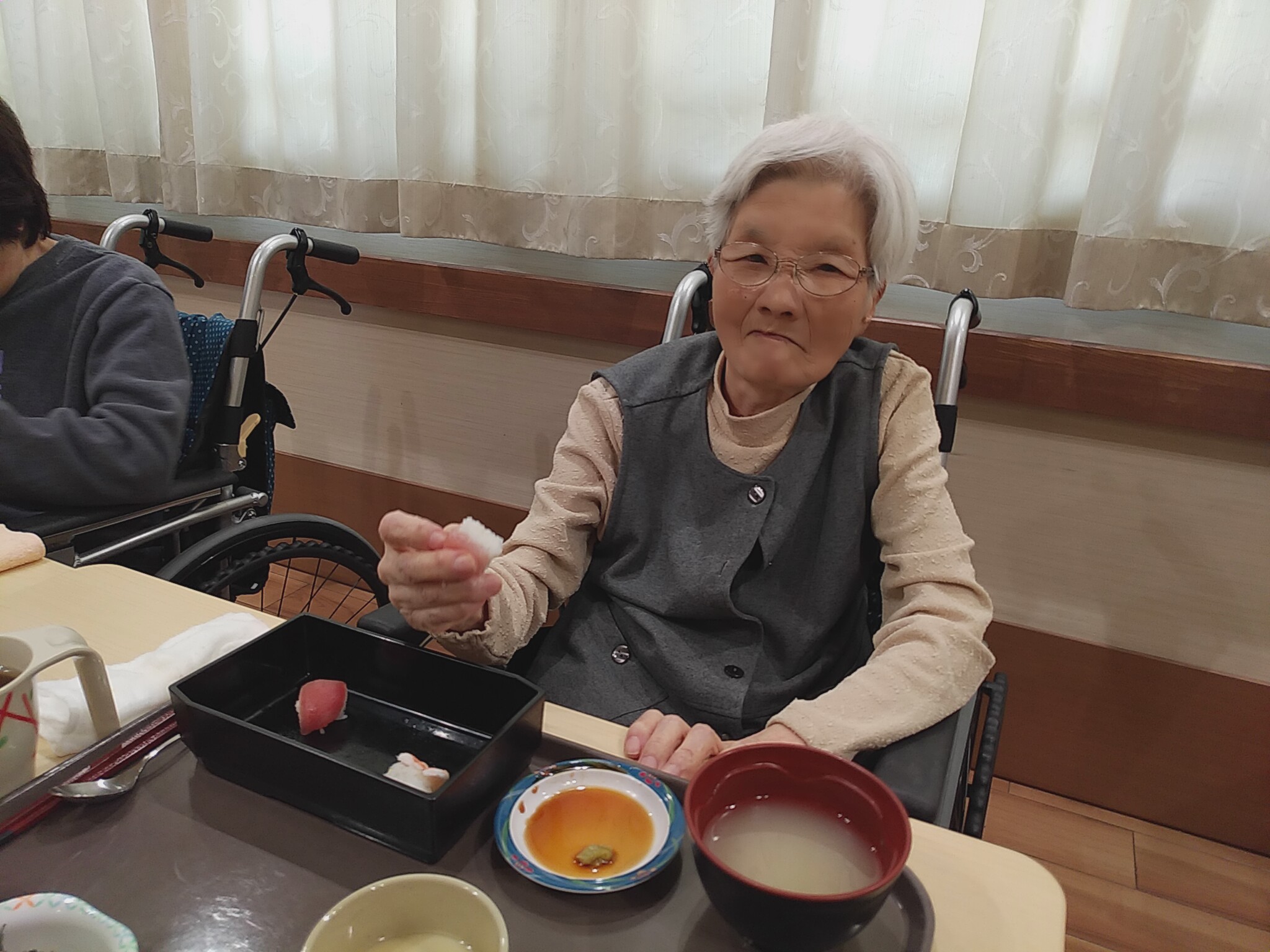 11月10日に今月の行事食「寿司御膳」の提供がありました。 お寿司のネタはまぐろ、サーモン、海老、はまち、穴子、ねぎとろ、たまごの7種でした。 朝から楽しみにされていた方もいたようでとても喜ばれていたご様子です。 お寿司が苦手な方には天丼の提供を行い、 お粥の方はねぎとろにいくらをのせて提供し皆様食べ進みが良いご様子でした。 当日のおやつは「井村屋水ようかん」を提供しこちらもご好評でした。