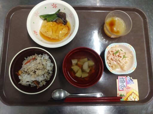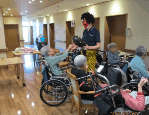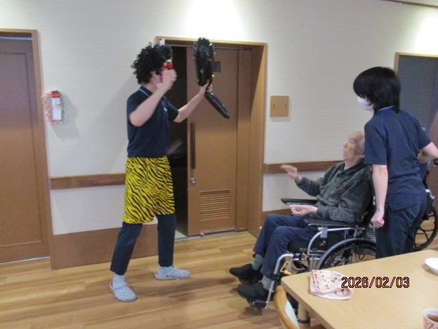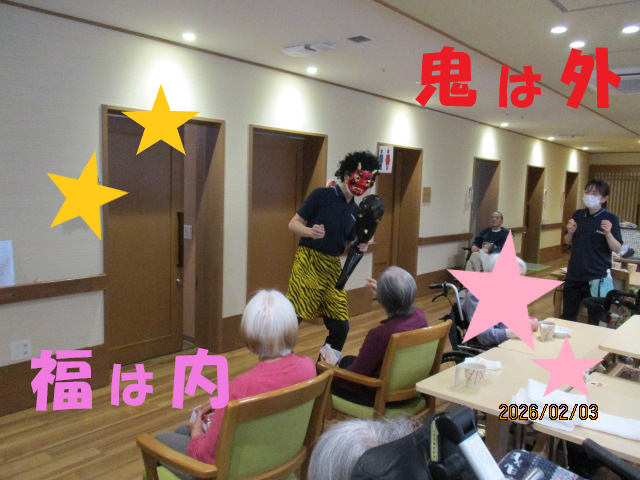 2月3日「節分」ということで各階で豆まきを行いました。 職員は鬼に扮し、皆様で「鬼は外、福は内!」と 大豆ではなく「甘納豆」の小袋を投げ行事を楽しまれ、 豆まきを終えた後はあまい甘納豆をおいしくいただきました。 昼食は大豆入りの炊き込みごはんや豆腐ハンバーグ、 デザートにはきなこムースを提供し お豆をたっぷり使用した節分献立を食べていただきました。