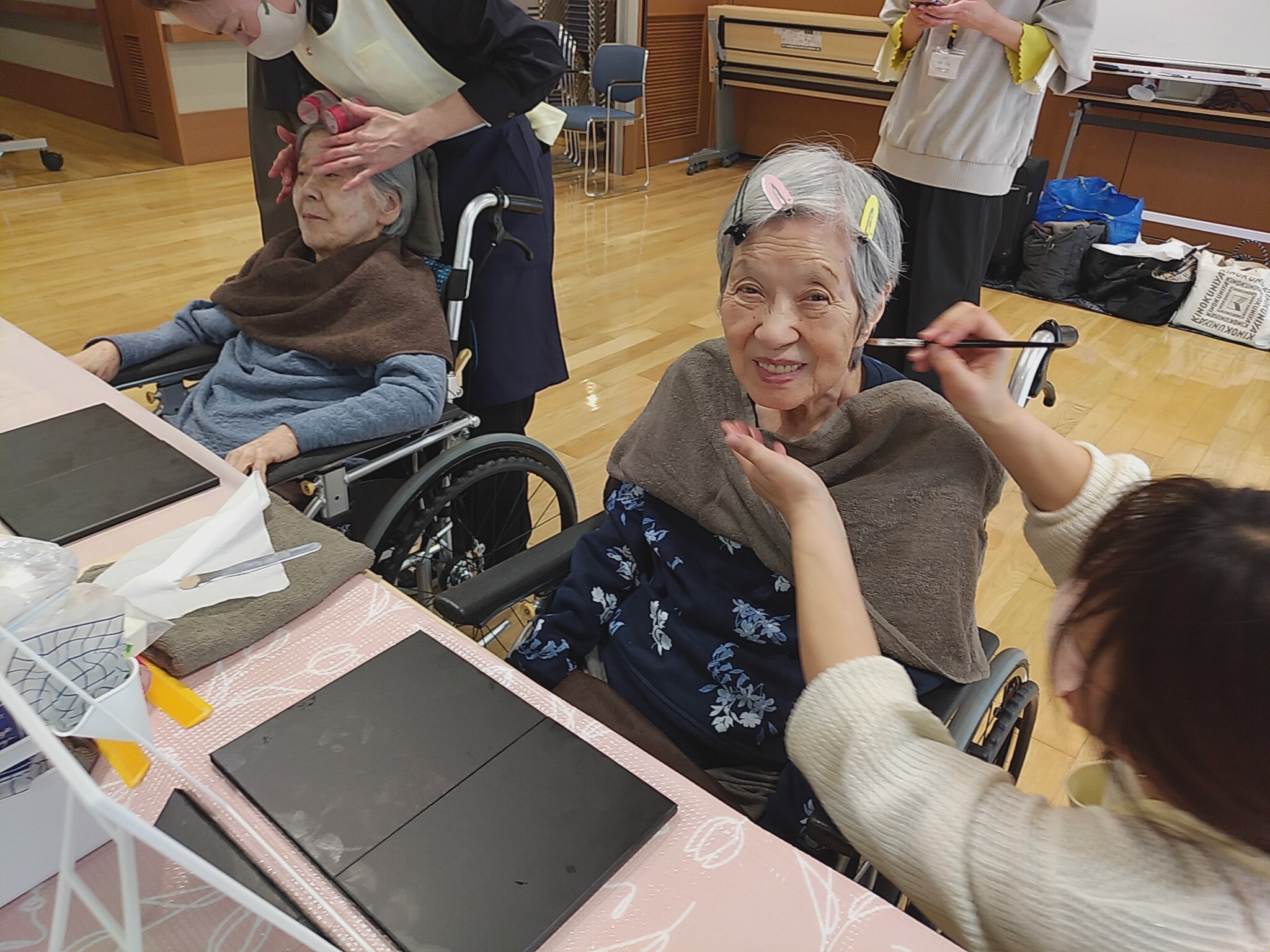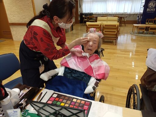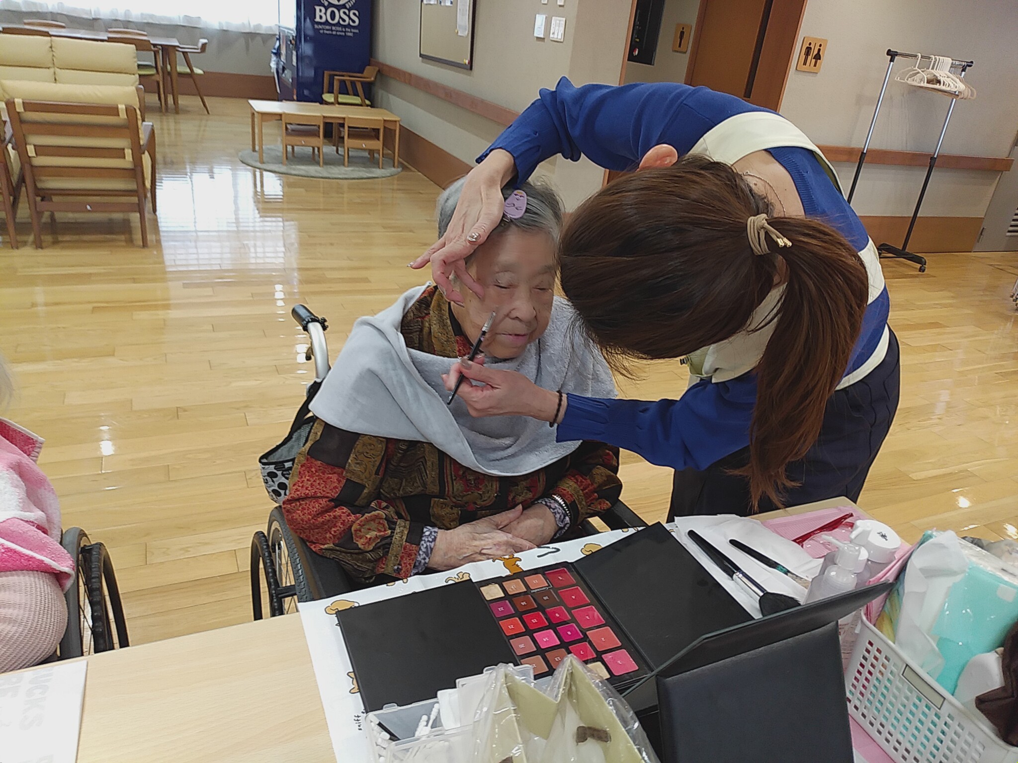 (株)ミライプロジェクト 介護美容研究所の方による 美容レクリエーション「ケアメイク」を行っていただきました。 スキンケアから始まり、 ファンデーション、アイブロウ、アイシャドウ、リップ等 ご利用者様に合わせた色合いのメイクをしていただき 最後に記念写真を撮りました。 「お化粧なんて何年振りかしら~。」 「うれしい!」 「少しはきれいになったかな?」と皆様にこやかに話されておりました。 おやつでは「あまおうのムースケーキ」を召し上がっていただきました♪